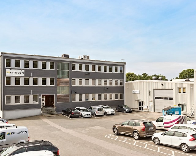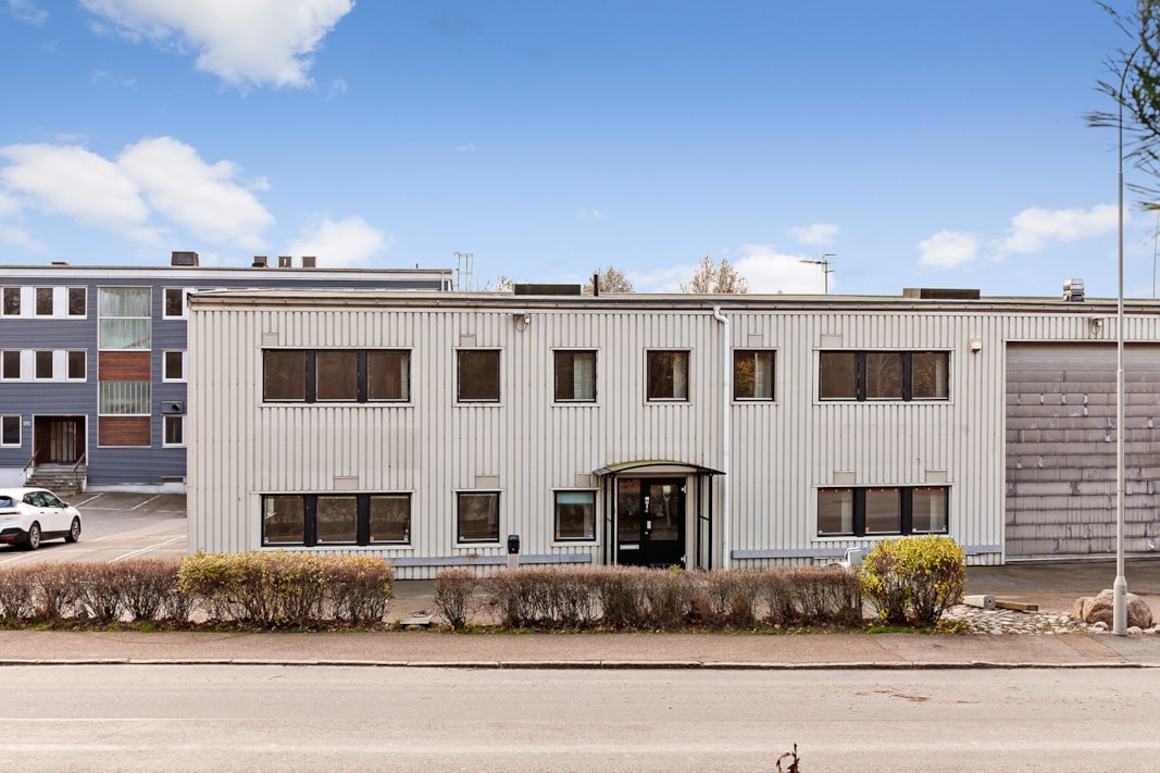 Fastigheten är bebyggd med två hus, en kontorsbyggnad i tre plan samt källare och en lagerbyggnad i två plan.
