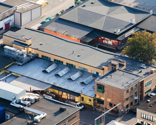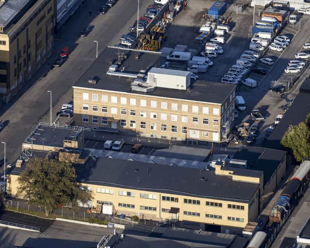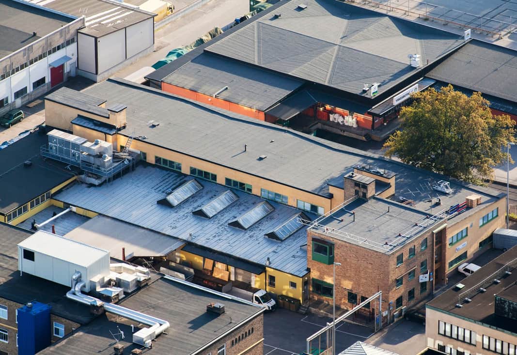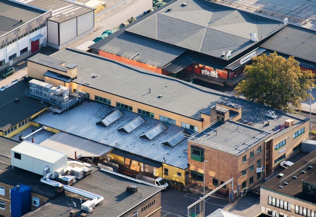 Industribyggnad med huvudsakligen två takplåtslagerier samt några kontorslokaler. Stort varmgarage under hela bygganden.