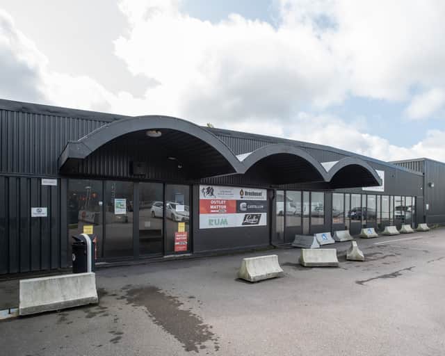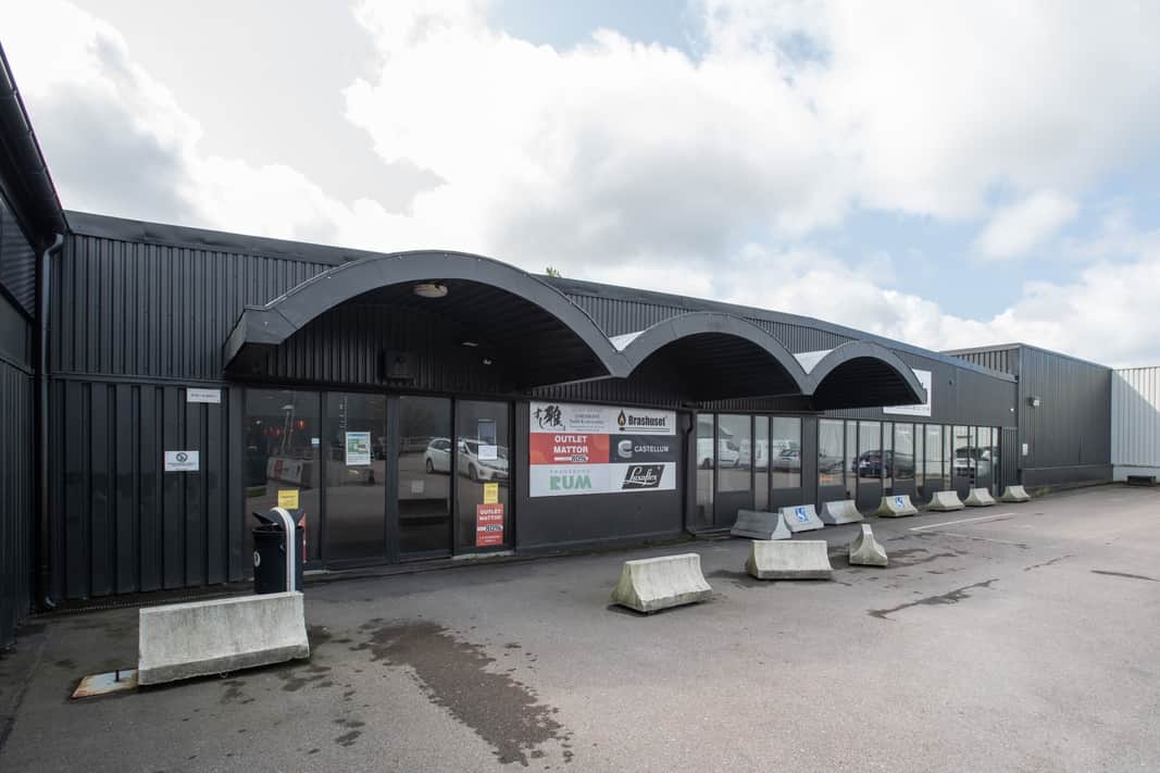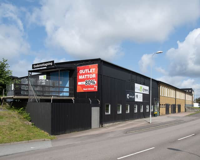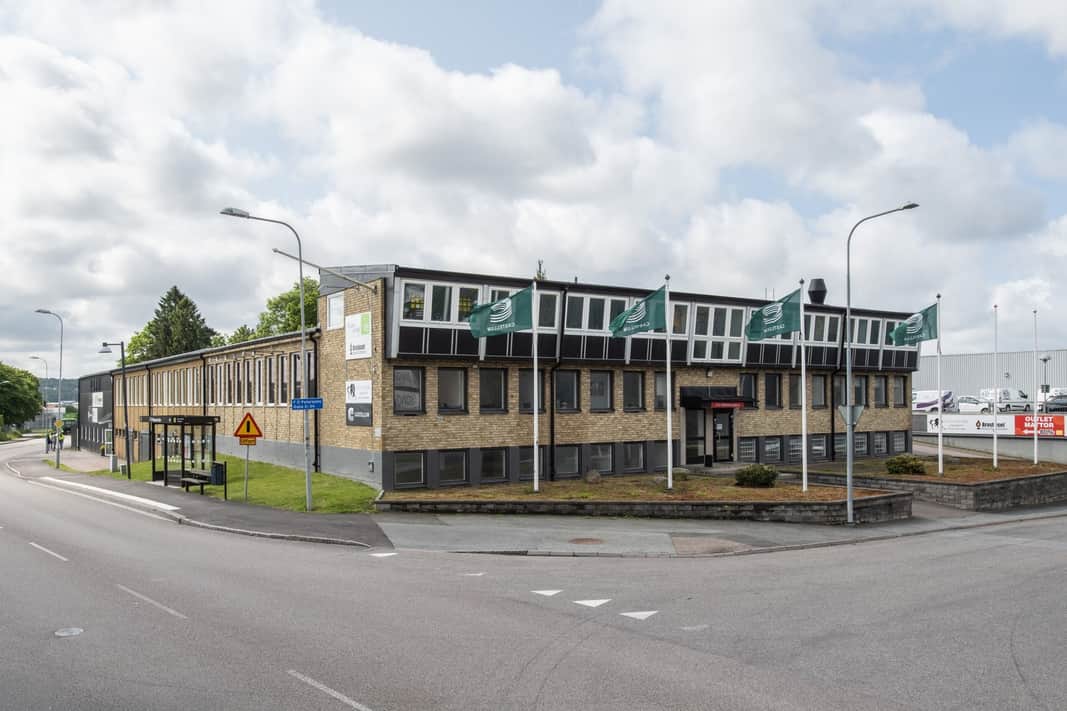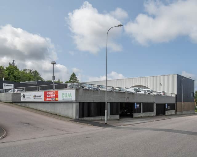 Kontorshus med servicebutiker och restaurang samt en stor lagerbyggnad