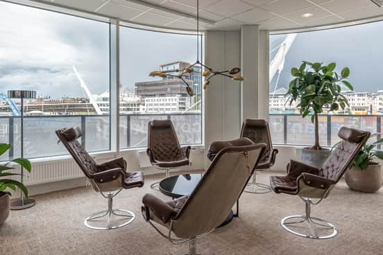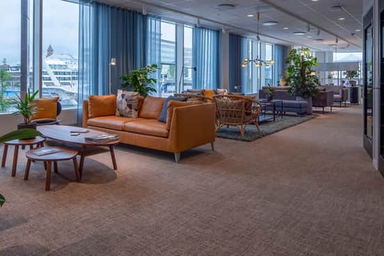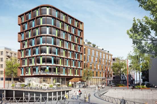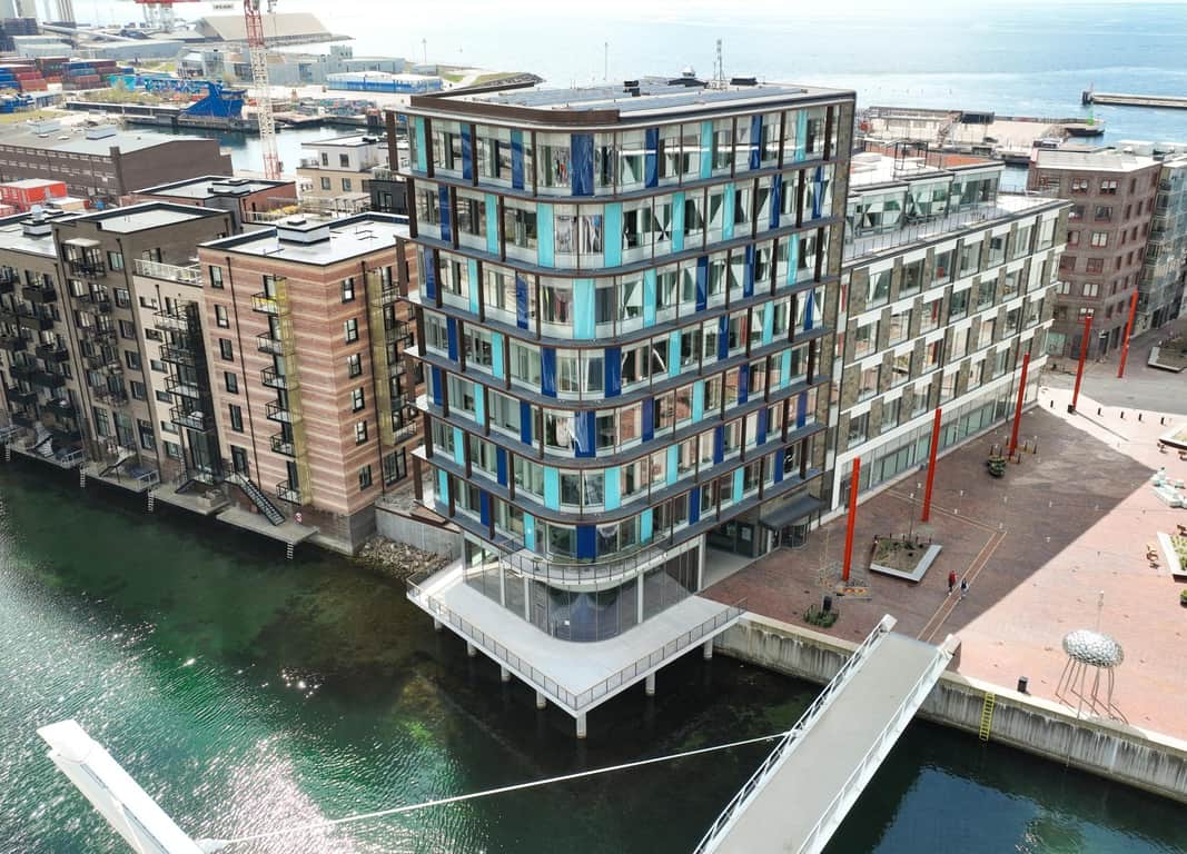 I markplan kluckar vattnet mot husets brygga, som är vänd in mot staden. I bottenplan doftar det gott från caféet , en energirik mötesplats för hela kvarteret. Ta med dig kaffet upp på utomhusverandan, med hänförande utsikt över sundet och Danmark, eller i parken vid kajkanten.