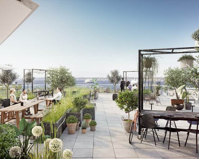 I markplan kluckar vattnet mot husets brygga, som är vänd in mot staden. I bottenplan doftar det gott från caféet , en energirik mötesplats för hela kvarteret. Ta med dig kaffet upp på utomhusverandan, med hänförande utsikt över sundet och Danmark, eller i parken vid kajkanten.