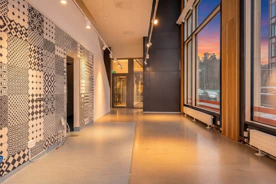 Här möts funktionalitet och trivsel i en varm och inkluderande miljö. Den rymliga inomhusgården, täckt av ett imponerande glastak, skapar en perfekt plats för möten och gemenskap. En elegant, snäckformad trappa leder upp till kontoren, där ljuddämpat glas säkerställer en lugn och produktiv arbetsmiljö.