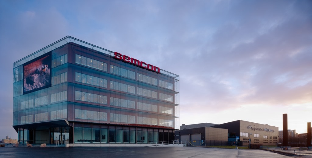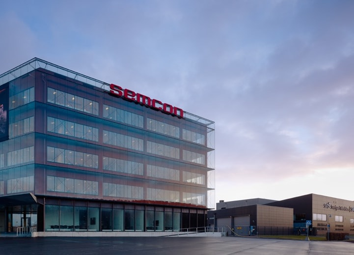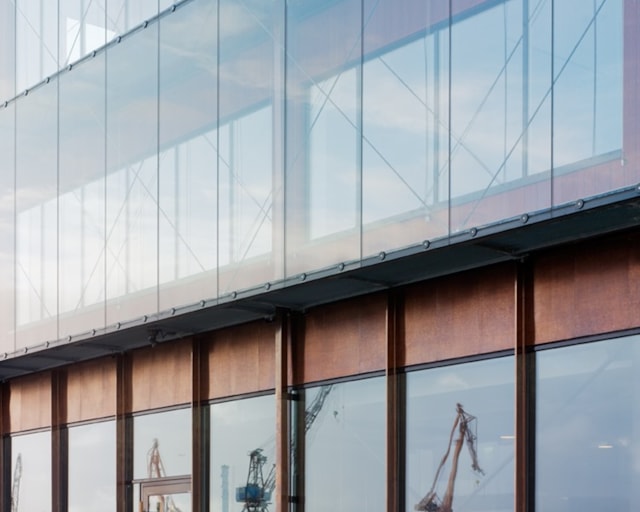 Modern kontorsfastighet med havsutsikt.