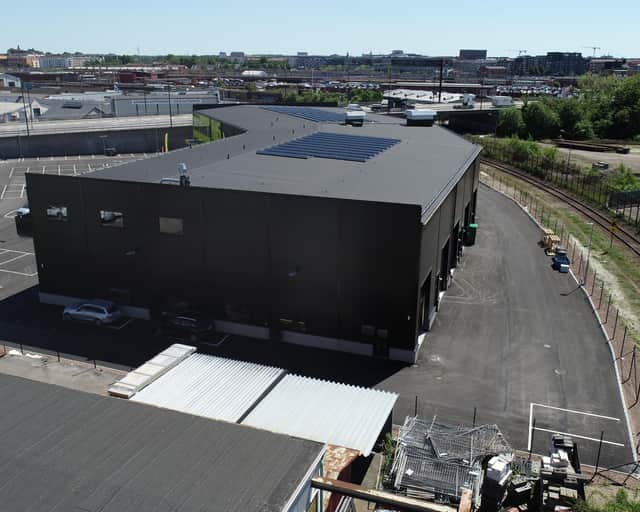 Nybyggd fastighet vid viadukten på Västkustvägen i direkt anslutning till Nyhamnen.