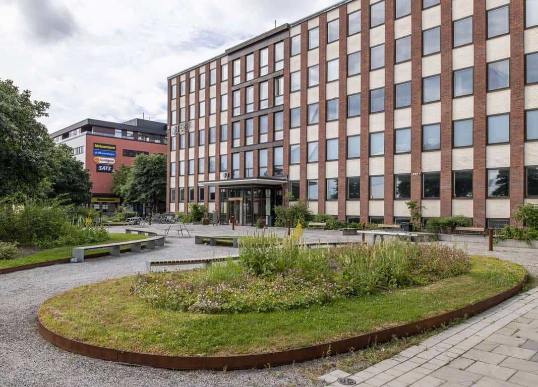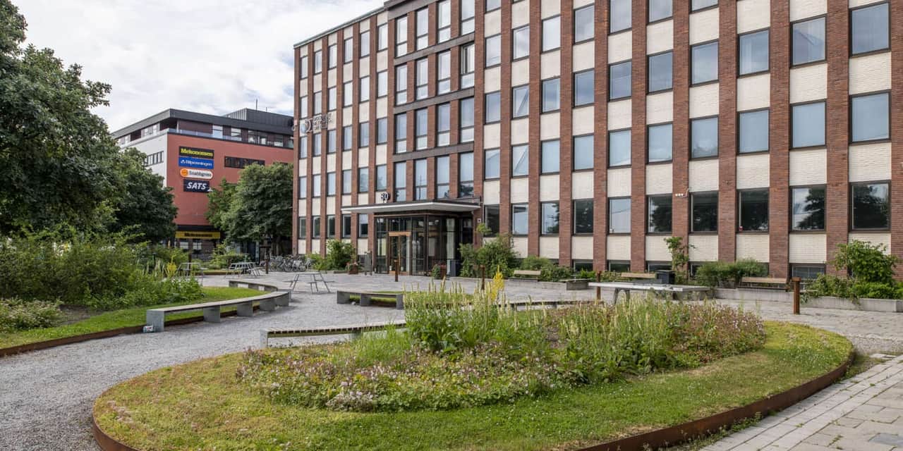 Precis utanför entrén breder ett charmigt, grönskande torg ut sig – en naturlig mötesplats med gemensamma sittbänkar i soligt läge. Här kan du ta en kaffe i solen, hålla informella möten utomhus eller bara njuta av en stunds avkoppling mellan arbetsuppgifterna.
