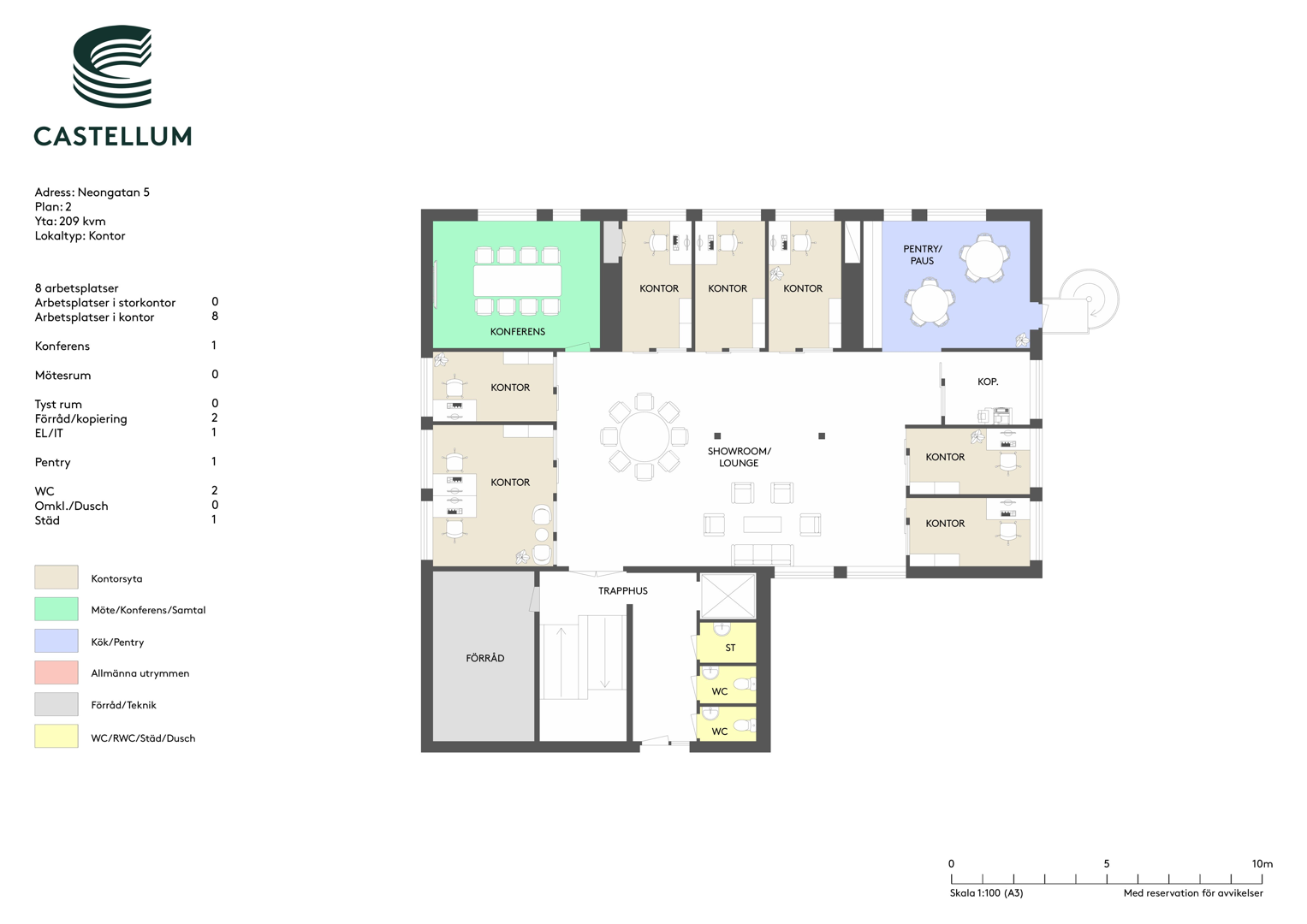 Planlösnigen består av enskilda kontorsrum, showroom/öppen yta, konferensrum, förråd och personalutrymmen.