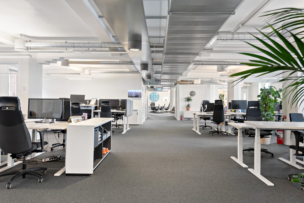 Kontorslandskap blandat med småkontor, mötesrum och konferensrum.