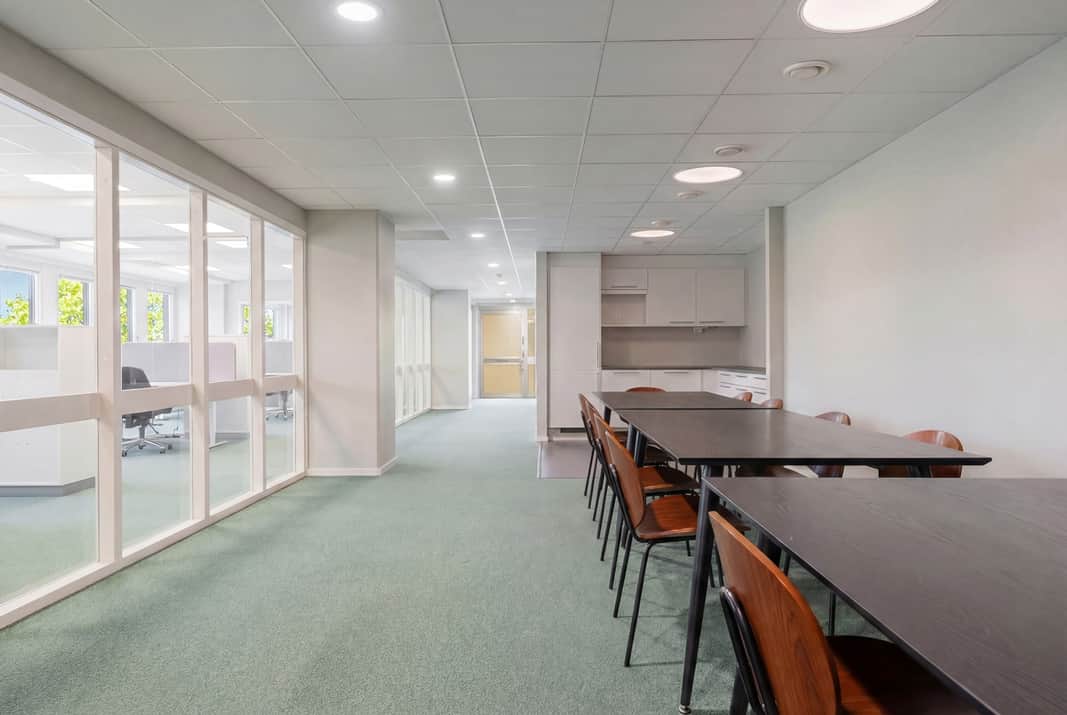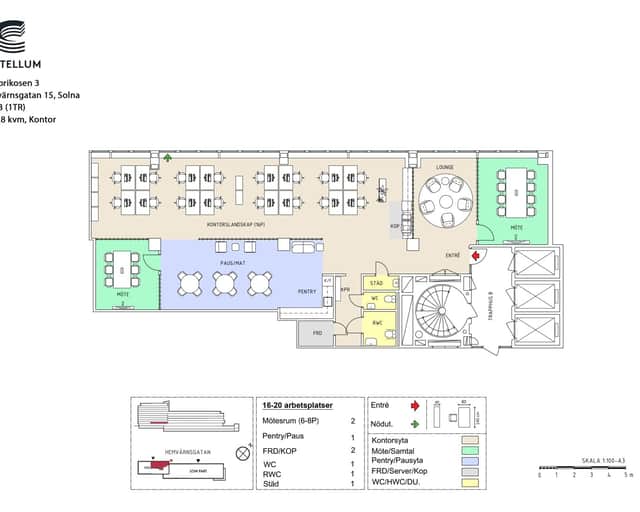 Lokalen präglas av generöst ljusinsläpp och glaspartier som skapar en luftig och trivsam arbetsmiljö. God tillgänglighet via trapphus och hiss.