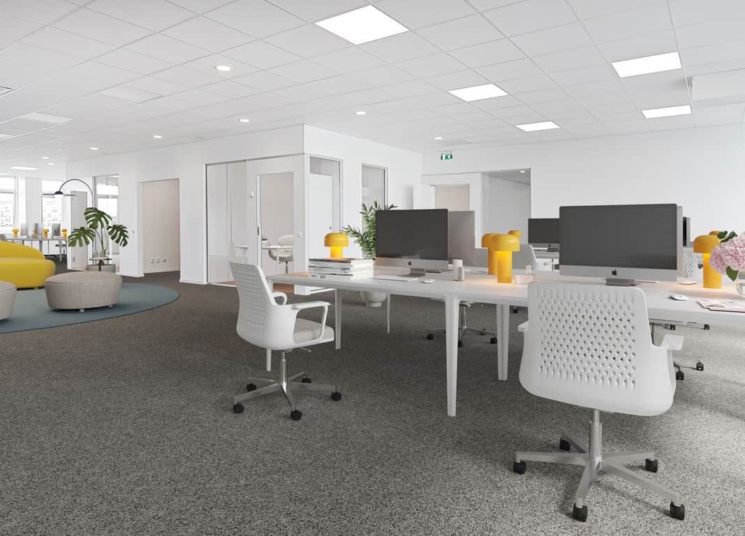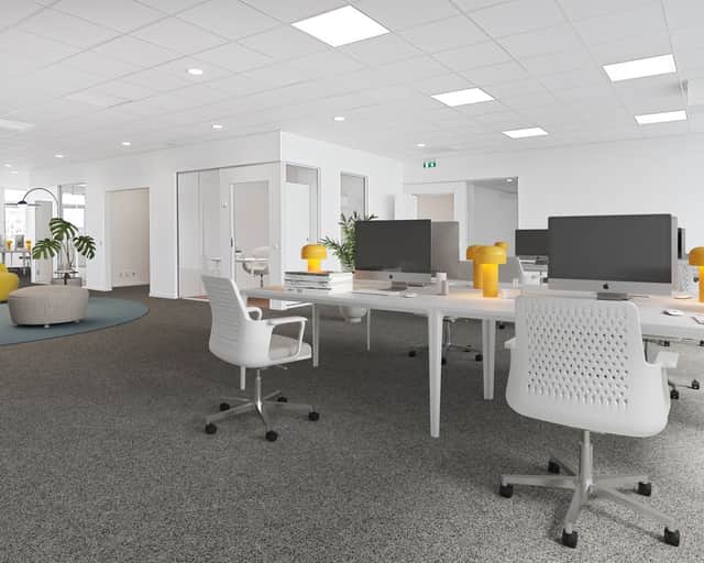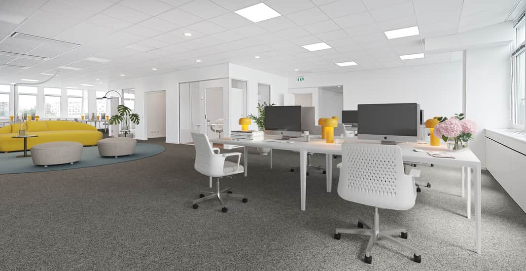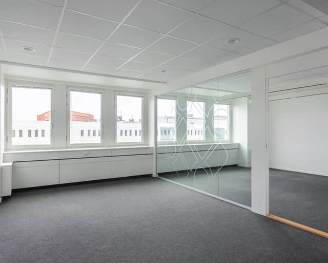 Välkommen till ett modernt och välplanerat kontor med mix av öppen planlösning, separata kontorsrum och mötesrum.