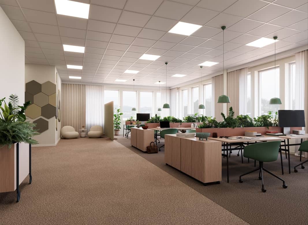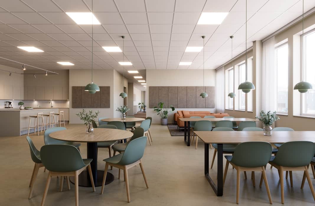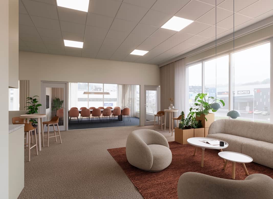 Kontors- och personalytor ges en varm och professionell känsla, medan butik- och showroomytor utformas med neutrala och tåliga material som lämpar sig väl för sällanvaruhandel och exponering.