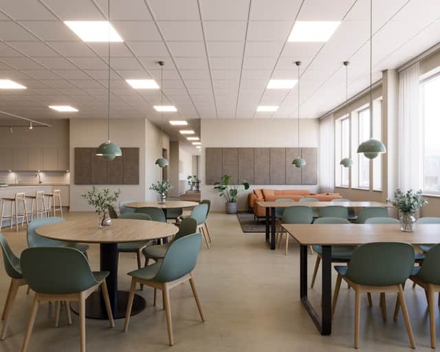 Fastigheten projekteras med ett modernt och tidlöst materialkoncept som skapar ljusa, funktionella och representativa miljöer. Förslaget omfattar bland annat ljusa väggar, slitstarka golv, god akustik samt moderna undertak och belysningslösningar.