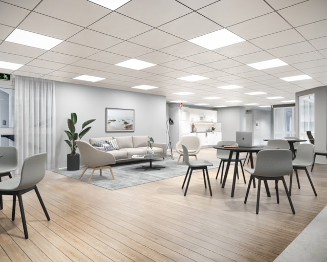 Lokalen har en rymlig loungyta där du och dina medarbetare kan koppla av och njuta av en välbehövlig paus eller ha ett avslappnat möte. Dessutom finns ett stort konferensrum som är perfekt för möten och kan enkelt anpassas efter behov med kontorsrum eller öppen arbetsyta, det som passar er bäst!