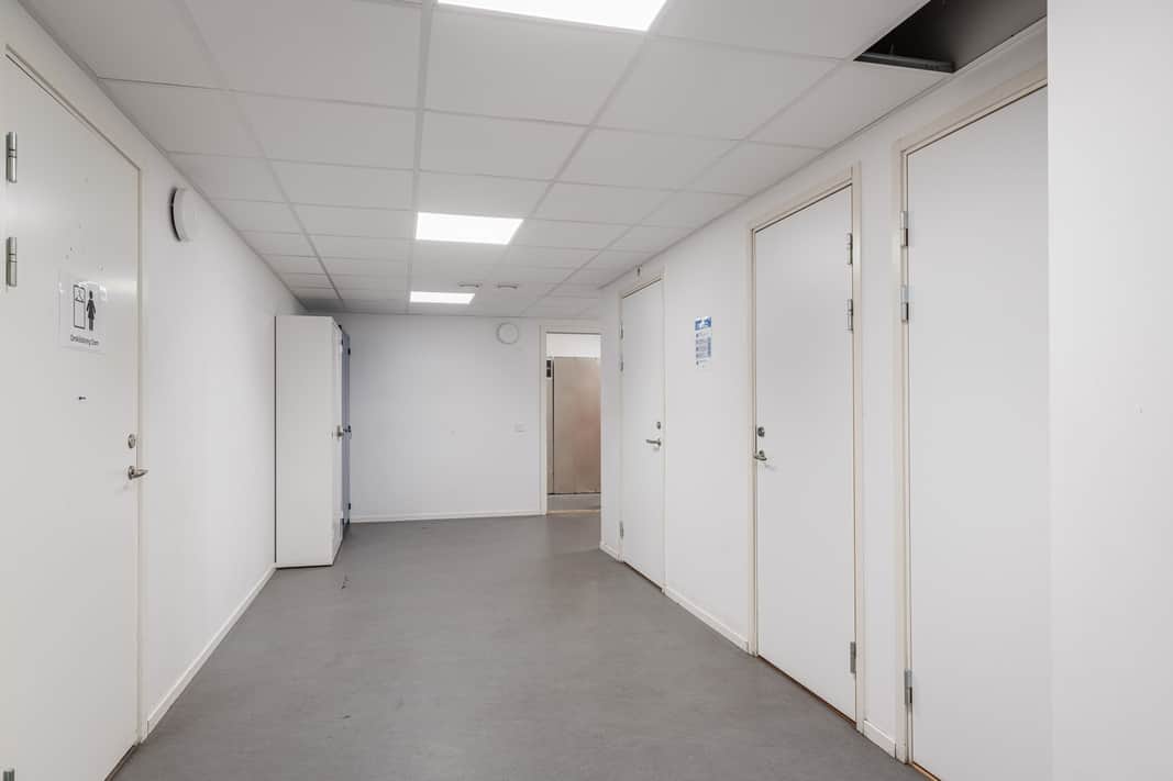 Blandad planlösning med kontor och öppna ytor. Personalutrymmen med omklädningsrum.