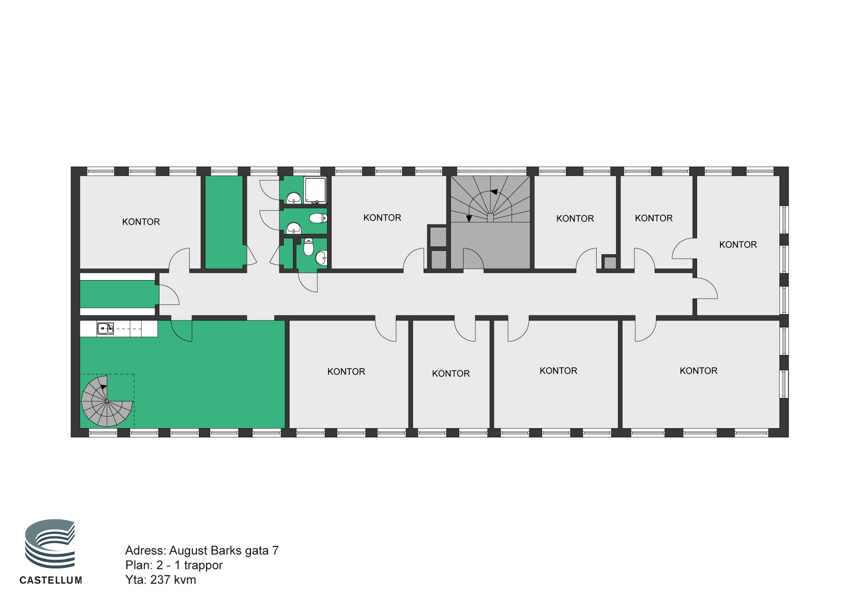 Lokalen är fördelad över tre våningsplan med eget trapphus. De två översta planen är sammanlänkade via en interntrappa som skapar en effektiv intern kommunikation. Planlösningen är idag rumsindelad med stora, ljusa rum, men kan enkelt anpassas eller byggas om efter hyresgästens behov. På varje våningsplan finns wc samt pentrydel.