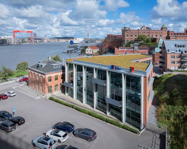 På andra våningen i denna välskötta fastighet finns en ljus och trvisam kontorslokal. Från de stora fönstren och de två balkongerna ser du ut över Göteborgs hamninlopp och Röda Sten.
