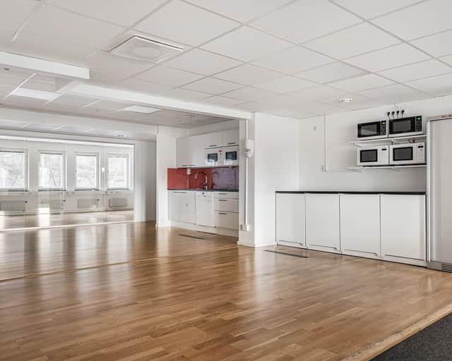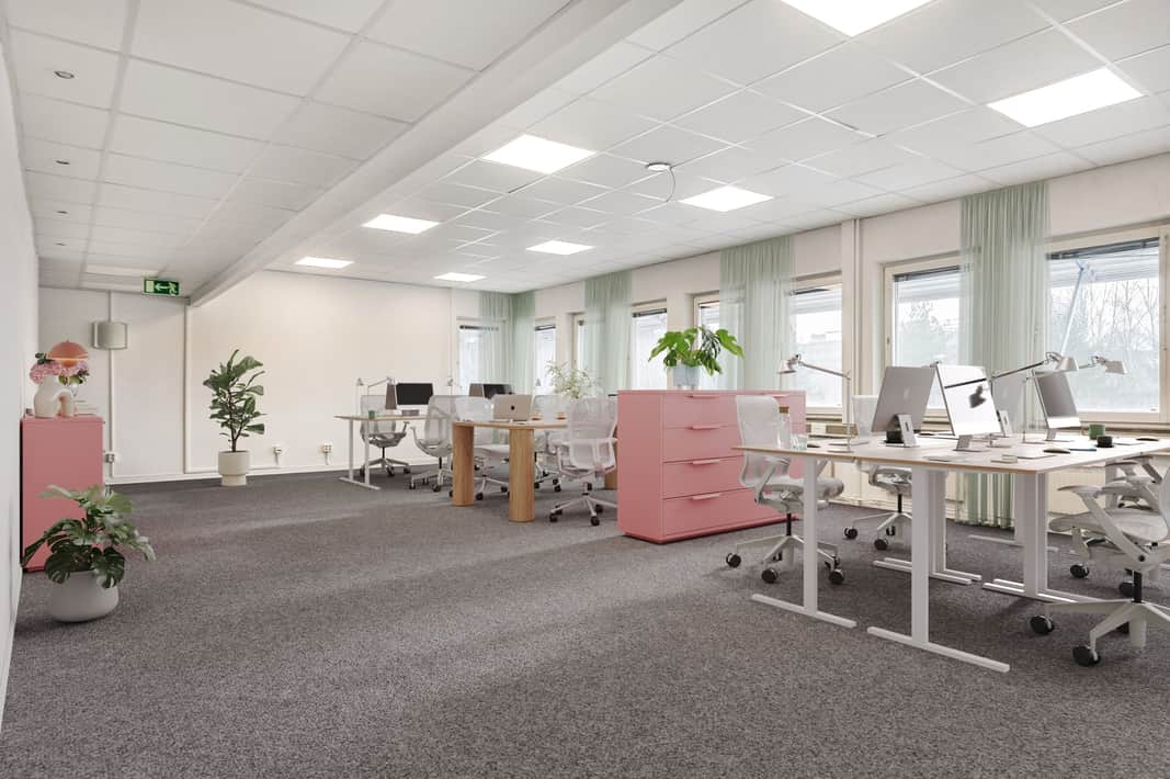 När du kliver in i kontoret möts du av en modern och luftig atmosfär, tack vare den blandade planlösningen som skapar en öppen och välkomnande känsla.