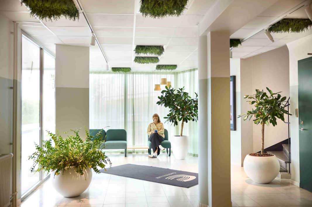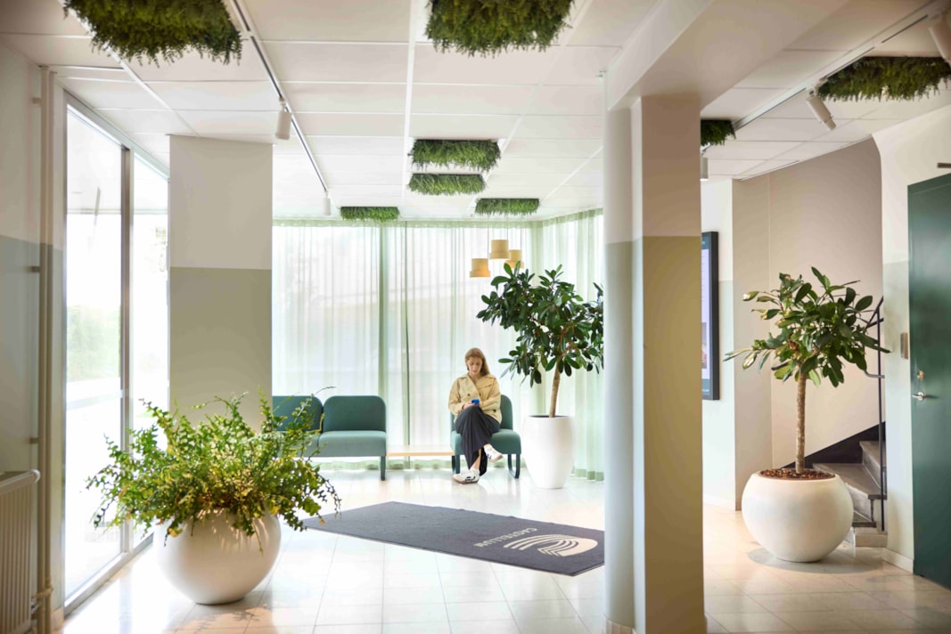 De ljusa ytskikten gör kontoret ljust och luftigt och fönsterna släpper in mycket dagsljus vilket ger en trivsam arbetsmiljö för medarbetare och besökare.