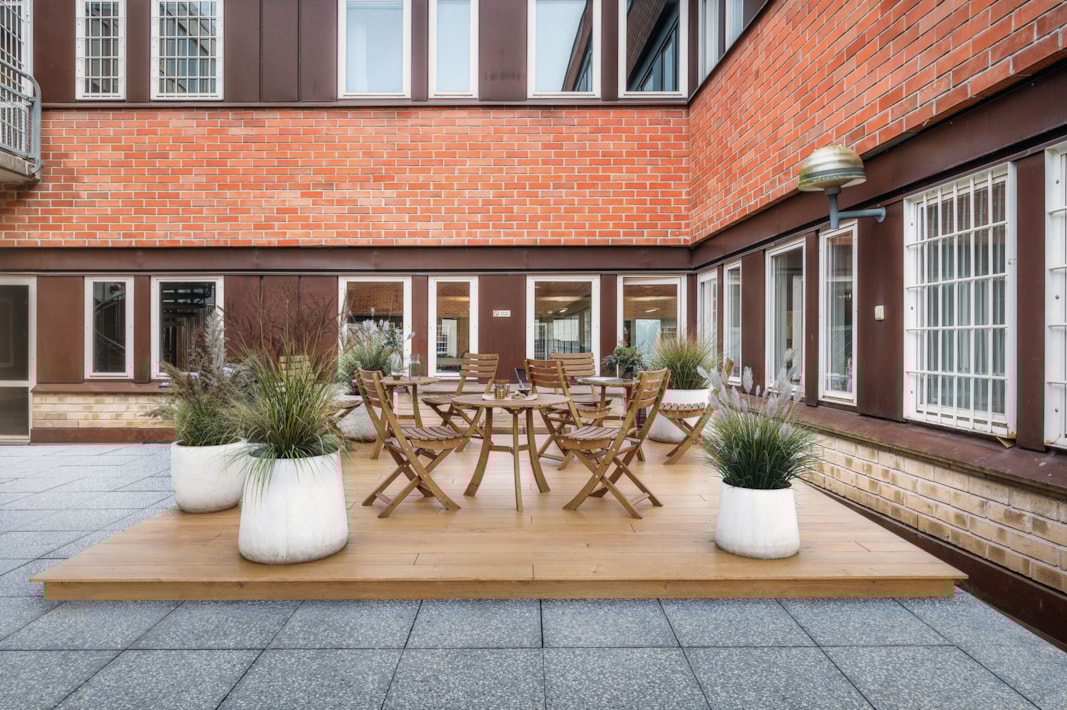 Lokalen har en välkomnande receptions yta, flera mötesrum och direkt tillgång till en fin och avskild uteplats.