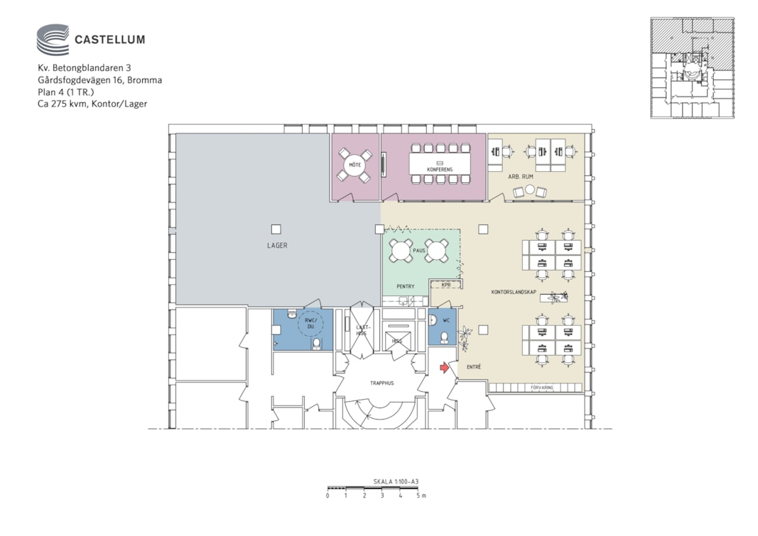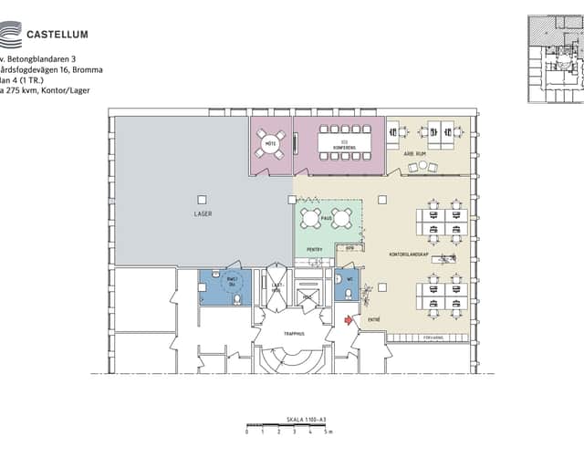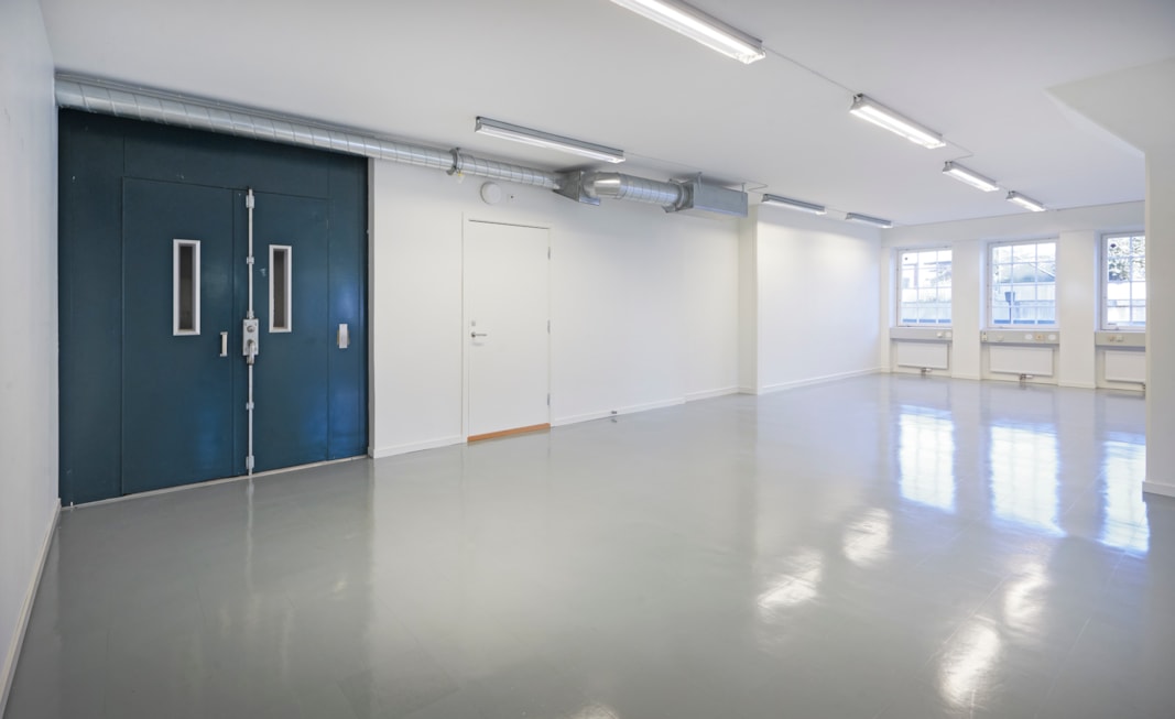Lokalen har en kontorsindelad planlösning och för att underlätta smidig inlastning finns en lasthiss i lokalen.