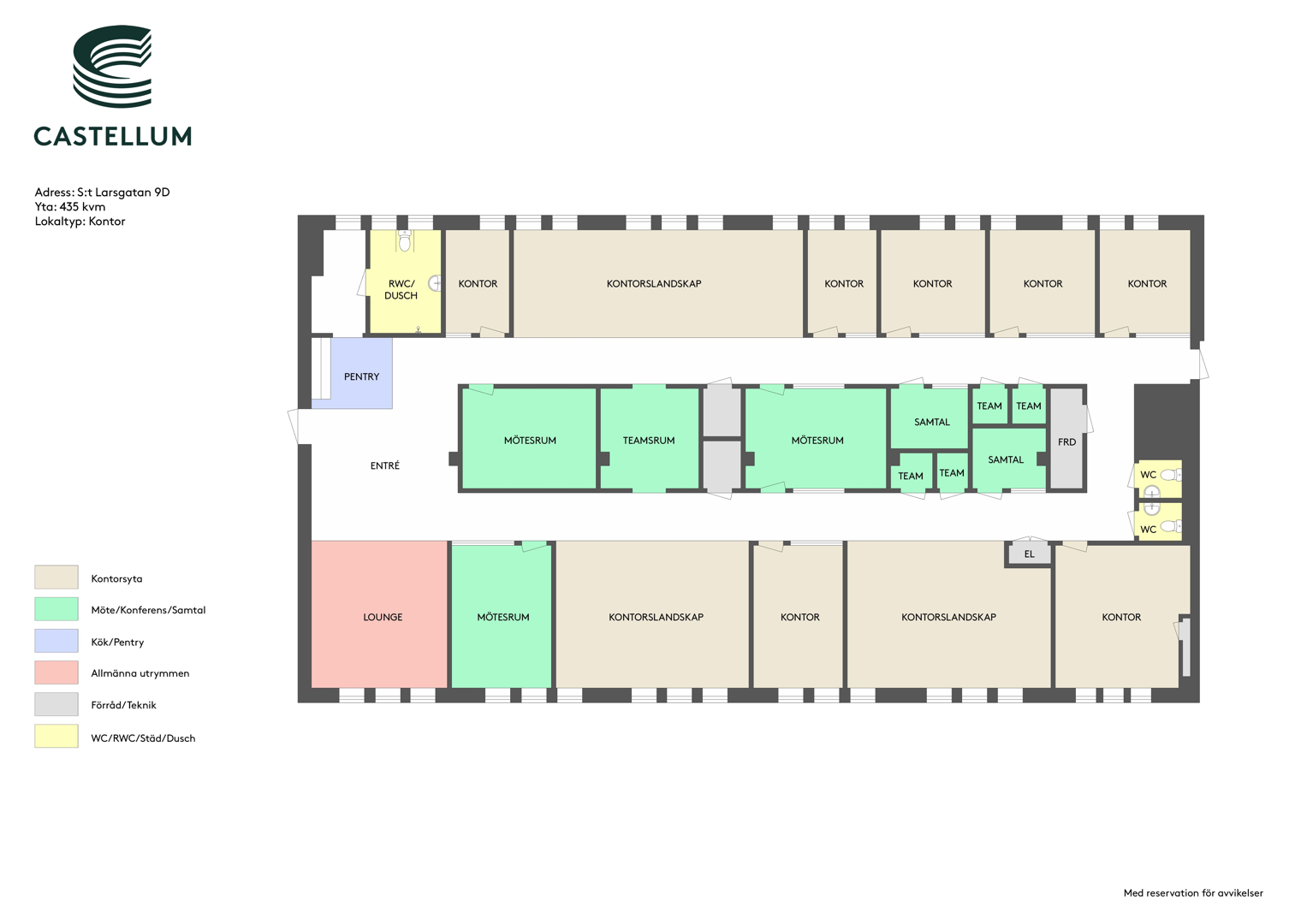När man kliver in i lokalen möts man av en välkomnande entréyta som med fördel kan användas som reception eller mottagning. Härifrån når man de olika delarna av kontoret som erbjuder en genomtänkt kombination av öppna och avskilda ytor. Lokalen har större och mindre kontorsrum och utöver detta finns även samtalsrum och konferensrum i olika storlekar samt rum för enskilt arbete, vilket gör lokalen flexibel och lätt att anpassa efter olika behov.
