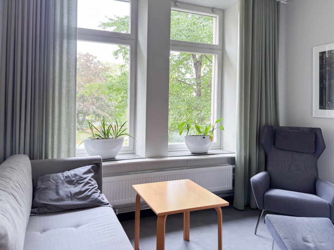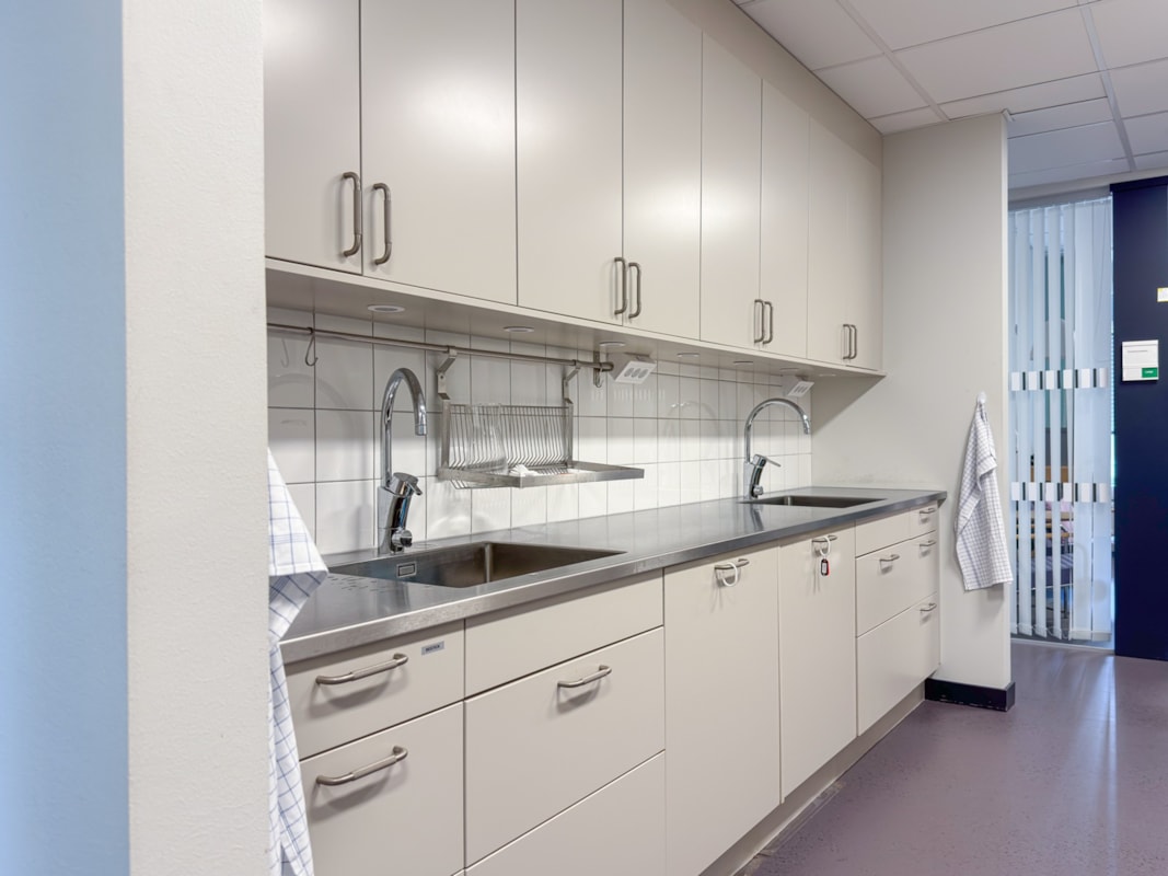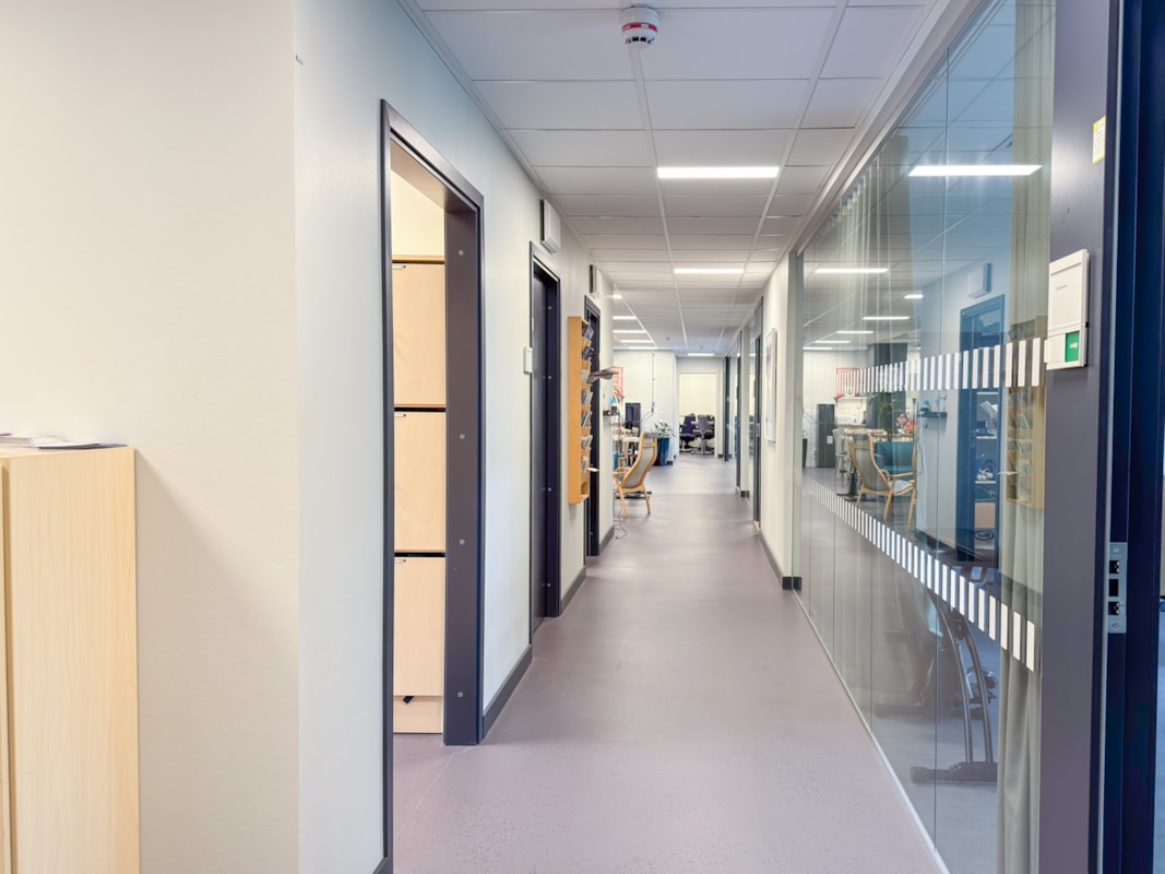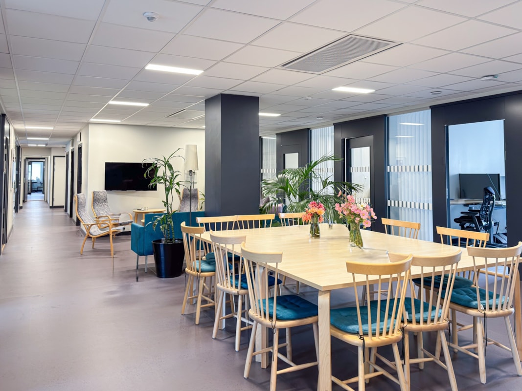 I hjärtat av kontoret finns en rymlig sällskapsyta med trivsam atmosfär där medarbetarna kan samlas för informella möten eller avkoppling över en kaffe. Runt sällskapsytan finns konferenslokaler, kontorsrum, samtalsrum i varierande storlekar. Lokalen har även ett praktiskt kök, kapprum samt post- och kopieringsrum.