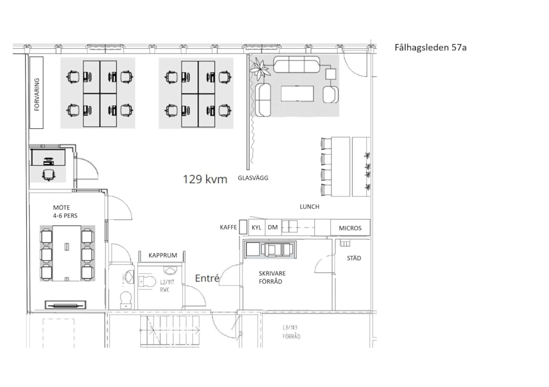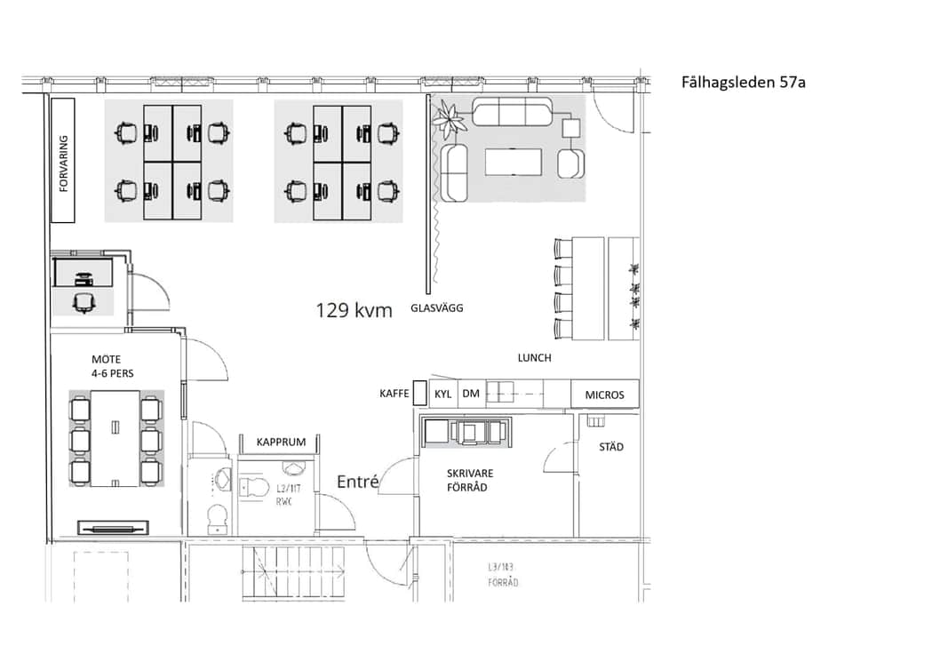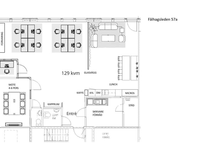 Entré via trapphuset. Lokalen är under ombyggnad och förbereds för öppen planlösning med samtalsrum, mötesrum och pentry. Möjlighet finns att ta upp dörr mot baksidan till en liten uteplats invid fasad. Alla ytskikt, pentry samt vitvaror i nyskick.