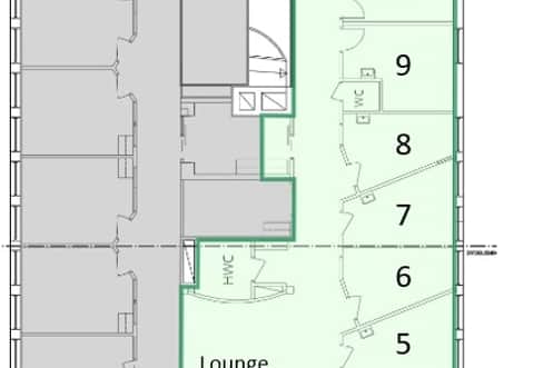 Gemensam entré med enkelt mötesrum och lounge, korridor med 10 kontorsrum samt två förråd. Välutrustat pentry med matplats i bortre delen av lokalen. Trevlig takhöjd i hela lokalen. Rummen hyrs ut i befintligt skick. Tillgänglighetsanpassad lokal.