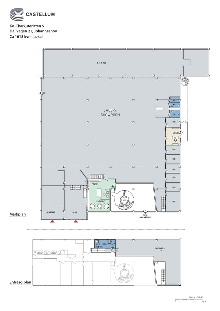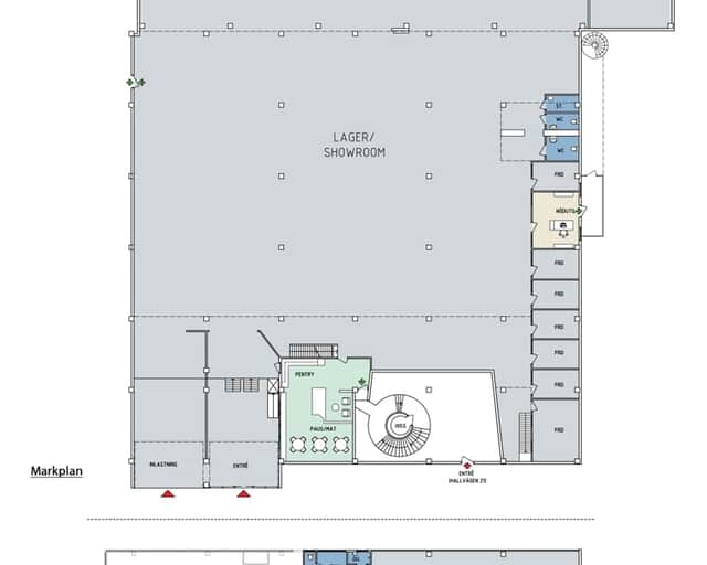 Längs ena sidan av lokalen är kontors- och personalutrymmen samlade, inklusive flera kontorsrum, konferensrum, pentry med paus-/matplats samt WC-grupp med RWC, omklädningsrum och dusch. Trapphus och hiss förbinder markplanet med entresolplanet, som erbjuder ytterligare disponerbar yta för exempelvis projektkontor, personalytor eller kompletterande lager.