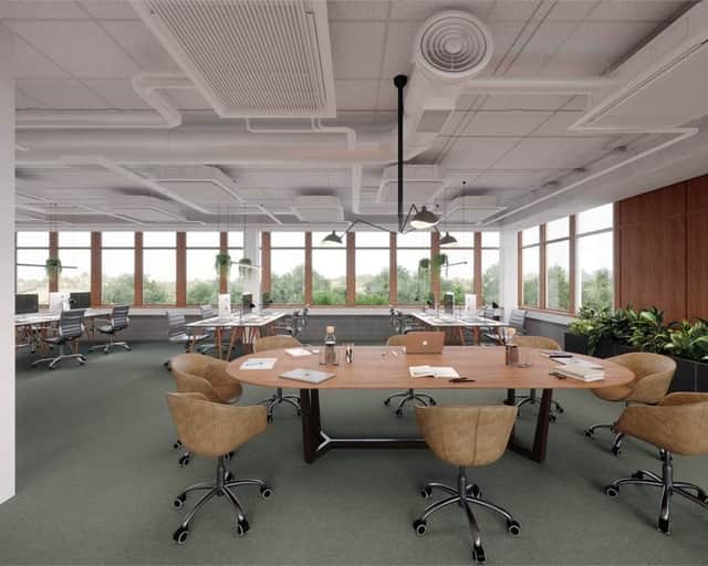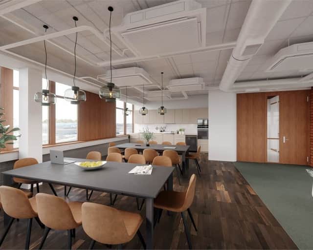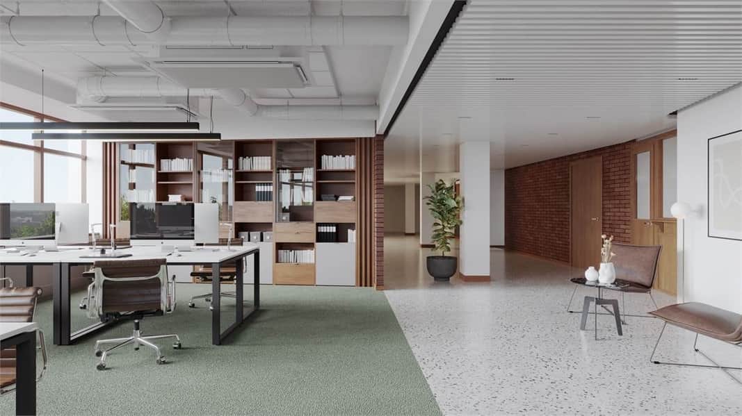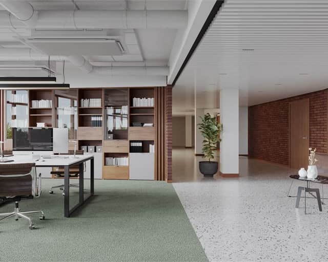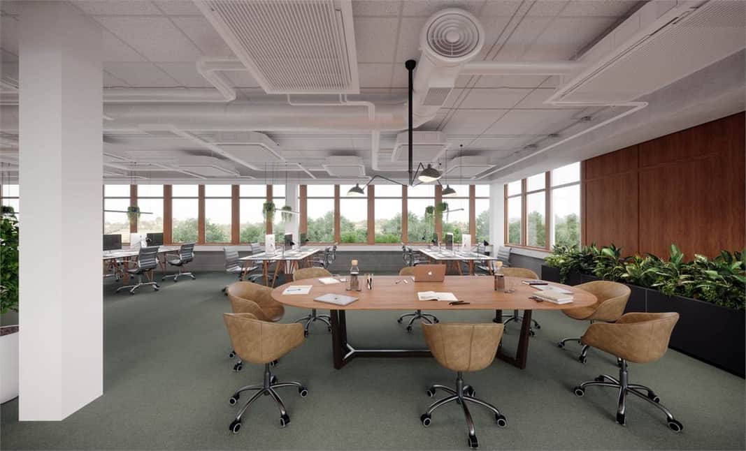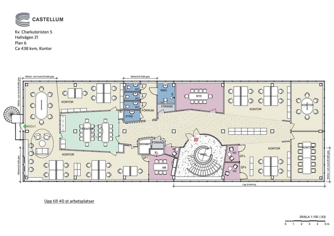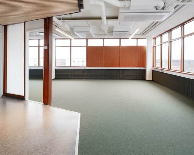 Planlösningen består av en blandning av kontor, konferensrum och öppet landskap. Med fönster i alla väderstreck får man ett bra ljusinsläpp som skapar en trevlig arbetsmiljö och tillsammans med den generösa takhöjden får lokalen en härlig rymd.