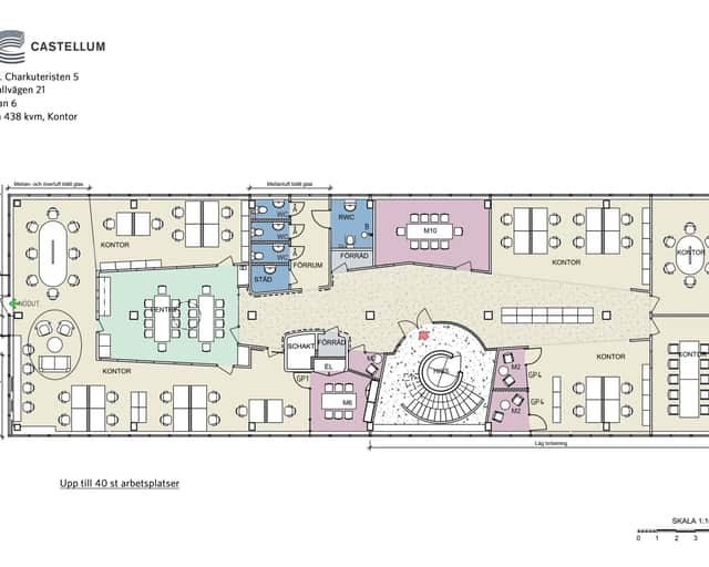 Kontorslokal om ca 438 kvm på plan 6, med möjlighet till upp till 40 arbetsplatser. Lokalen har en effektiv och tydlig planlösning med flera öppna kontorsytor längs fasaderna, vilket ger gott ljusinsläpp och flexibel möblering.