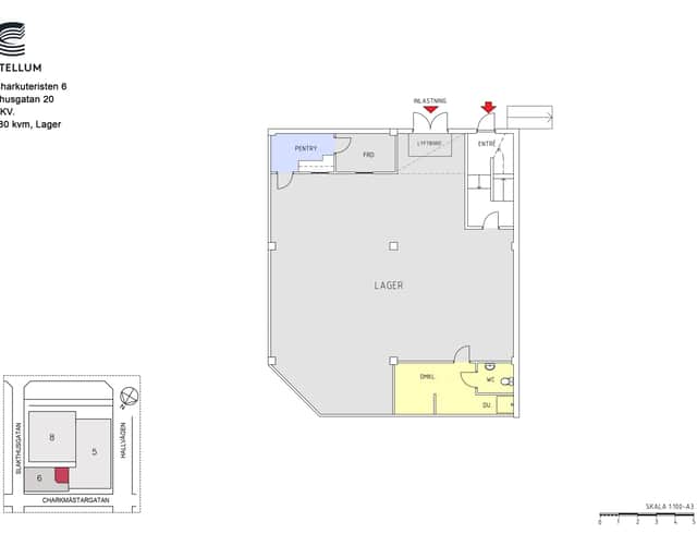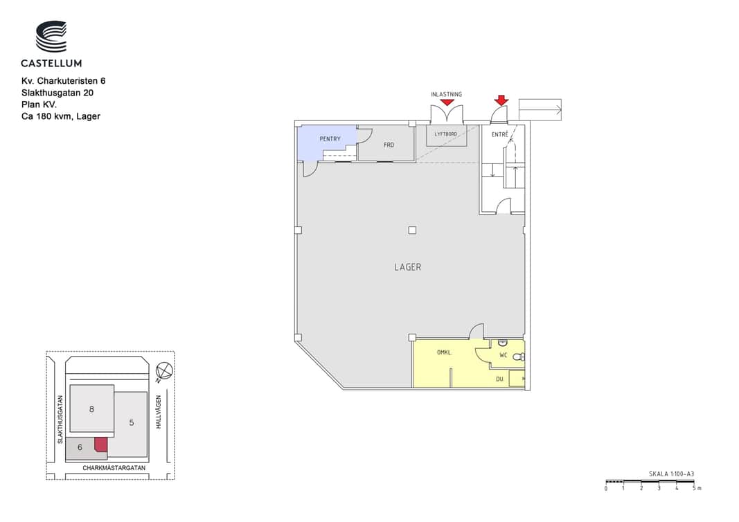 Lokalen omfattar cirka 180 kvm och består huvudsakligen av en större lageryta. Planlösningen är enkel och funktionell med tydliga rumsligheter och god logistik mellan lager och stödfunktioner.