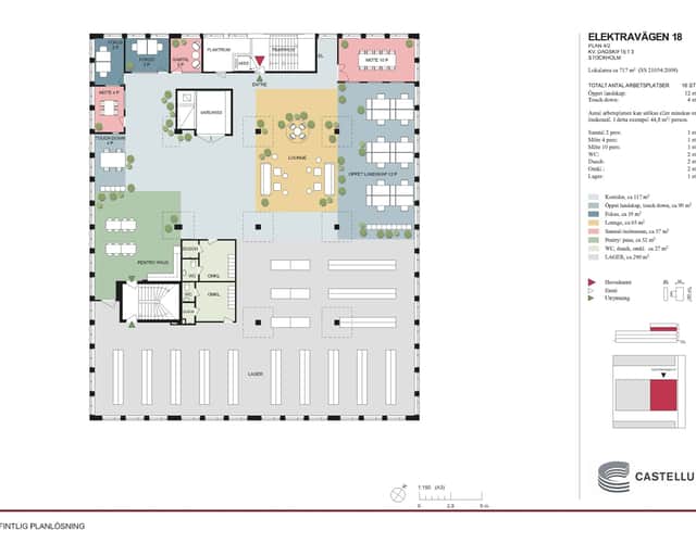 Kontors- och lagerlokal om ca 717 kvm på plan 4, med en tydlig och flexibel uppdelning mellan arbetsytor, möten, gemensamma ytor och lager. Lokalen är anpassad för cirka 16 arbetsplatser, fördelade mellan öppet landskap och touchdown-platser, samt kompletterad med fokus- och samtalsrum.