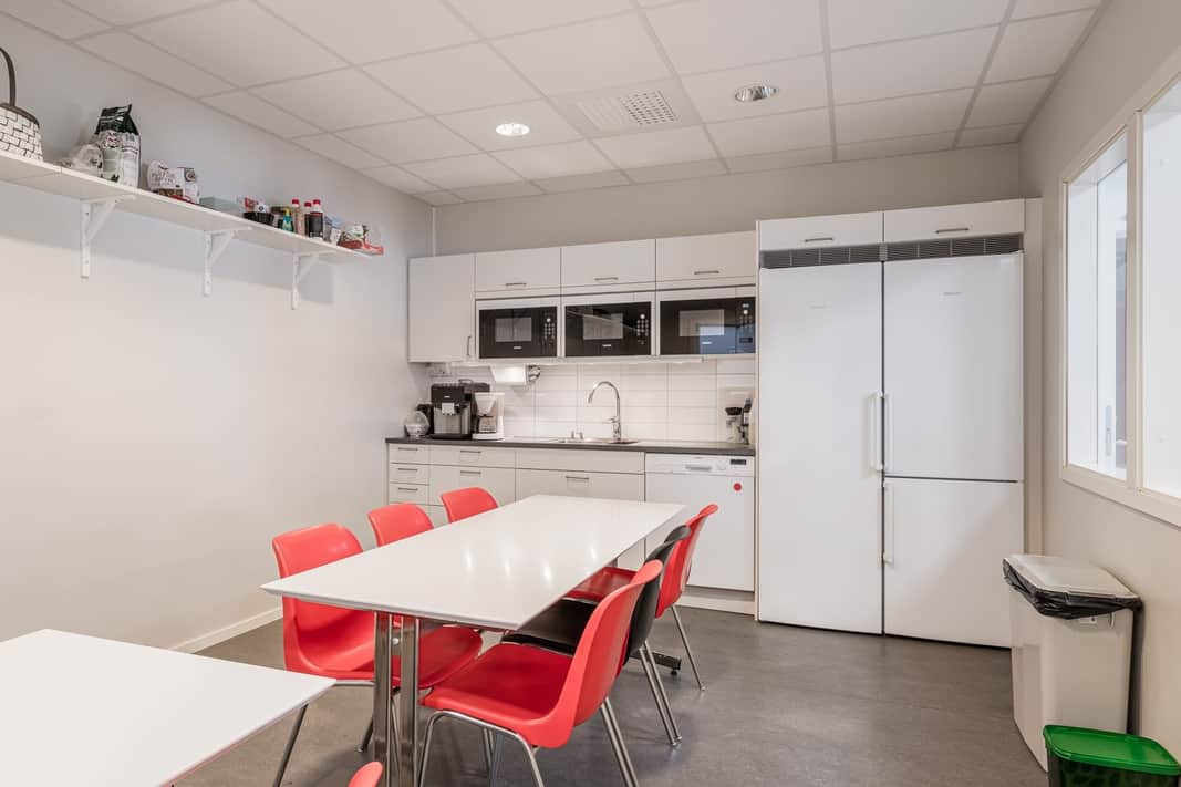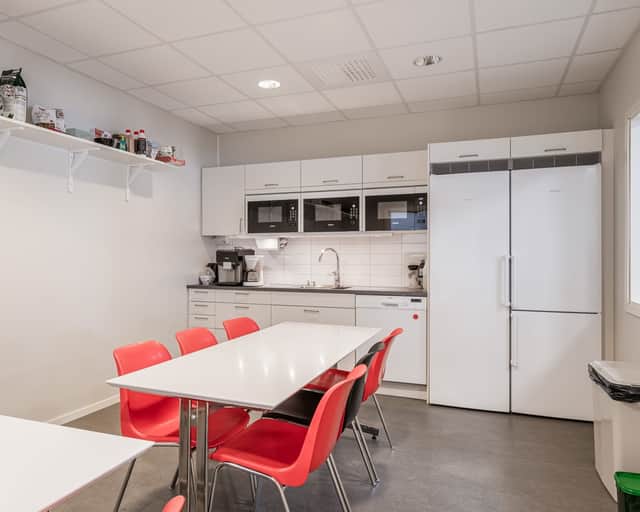Lokalen har en praktisk planlösning med en öppen kontorsyta, separat pentry och pausrum, HWC samt omklädningsrum. Lagerdelen nås via en egen markport, medan kontoret har en separat entré. Allt i markplan för enkel tillgänglighet och effektiv logistik.