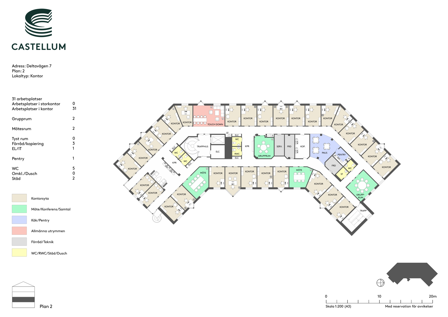 Planlösningen är väl genomtänkt och erbjuder ett helt våningsplan om 724 kvadratmeter med generösa ytor och god funktionalitet. Lokalen rymmer upp till 32 enskilda kontorsrum som möjliggör både koncentrerat arbete och flexibilitet i organisationen. Flera mötes- och grupprum är strategiskt placerade för att underlätta samarbete och effektiv kommunikation. Två trivsamma pausytor, varav en med ett anslutande pentry, skapar naturliga samlingspunkter för personalen. Lokalen är även utrustad med fem toaletter, en städskrubb, ett kopieringsrum samt gott om förvaringsutrymmen. Sammantaget erbjuder planlösningen en arbetsmiljö som är både funktionell, attraktiv och väl anpassad för dagens behov.