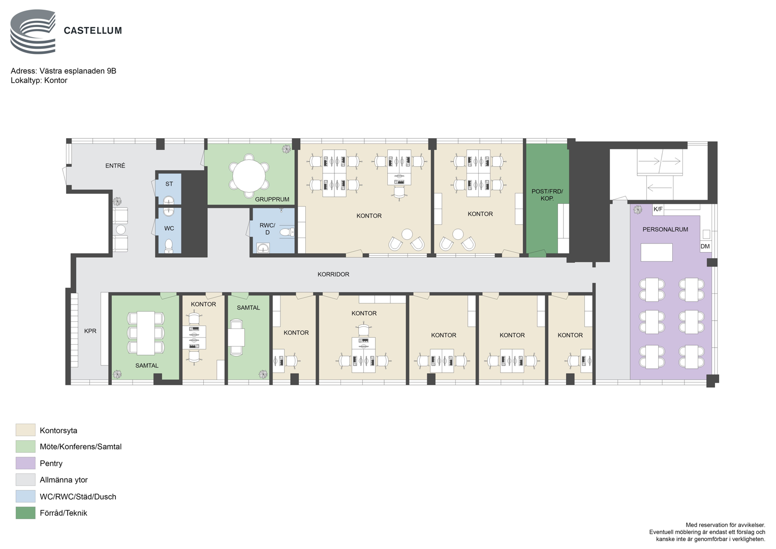 Ta hissen högst upp i fastigheten och kliv in i den välkomnande entrén och häng av dig ytterkläderna i det anslutande kapprummet. Fortsätt sedan vidare in i kontoret som erbjuder 11 mötes-/kontorsrum i varierande storlekar från 9,7 kvm till 41 kvm. Det stora personalrummet om 52 kvm erbjuder en härlig plats att avnjuta sin lunch eller en kopp kaffe med kollegorna. Här finns det även ett rymligt post/kopieringsrum, två toaletter varav en rwc, samt ett städförråd.