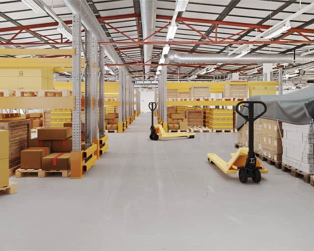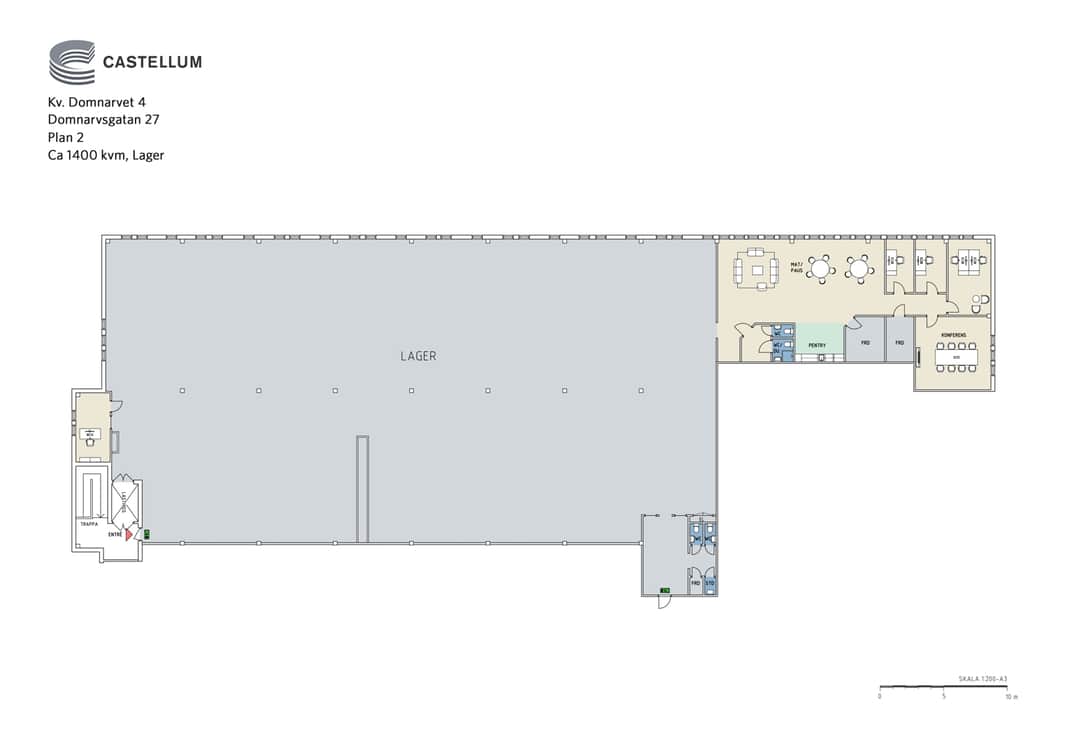 En trappa upp finns detta fräscha lager om 1400 kvm. In- och utlastning sker via lastkaj och lasthiss vilket gör det enkelt för logistikflöden.