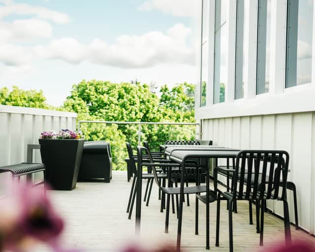 På taket finns en gemensam takterrass där man kan njuta av en kaffe i solen.