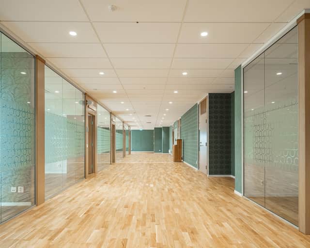 Planritningen välkomnar dig med en ljus och inbjudande entré, där varje steg leder till en arbetsmiljö som omfattar mångfaldiga planlösningar. Från öppna samarbetsområden till privata mötesrum och avkopplande utomhusytor – varje arbetsuppgift har en dedikerad plats här