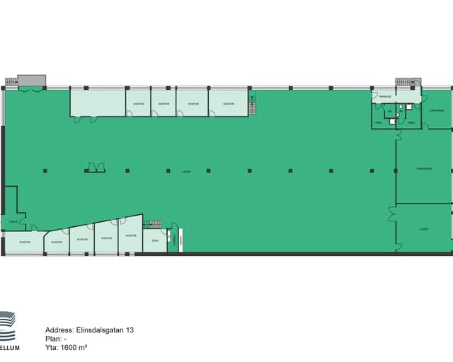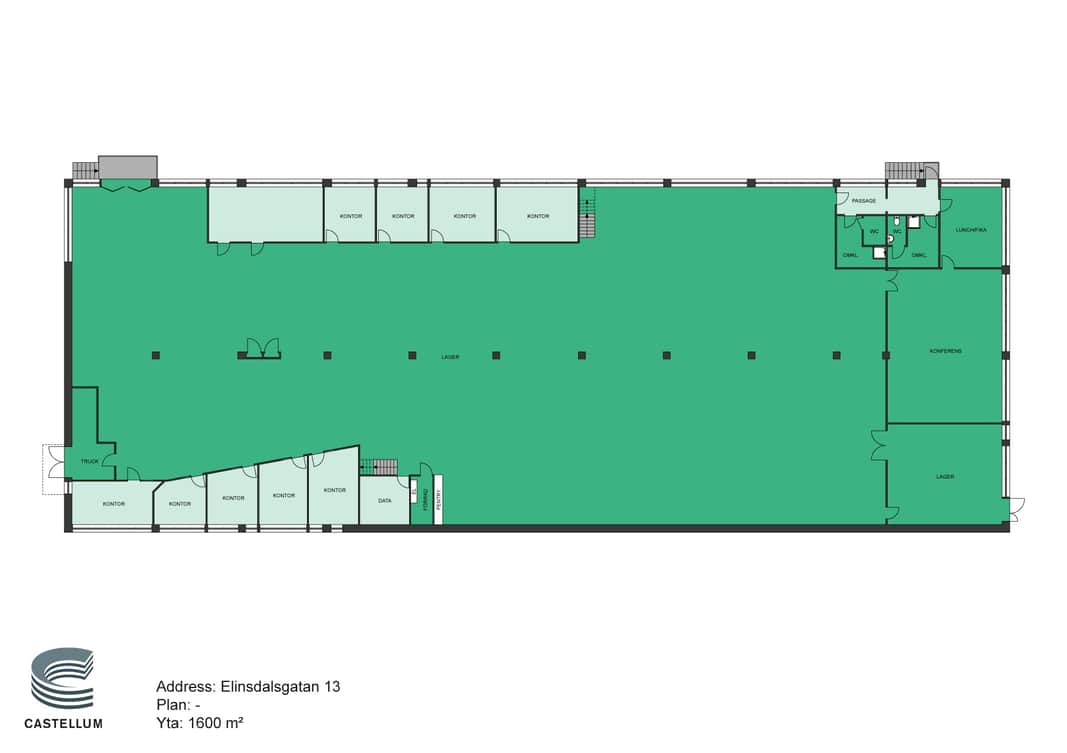 Lättillgängligt belägen i markplan med inlastningsmöjligheter via port i markplan och lastbrygga. Stora öppna ytor samt kontorsrum, mötesrum och personalytor så som pausrum, omklädningsrum och duschar.