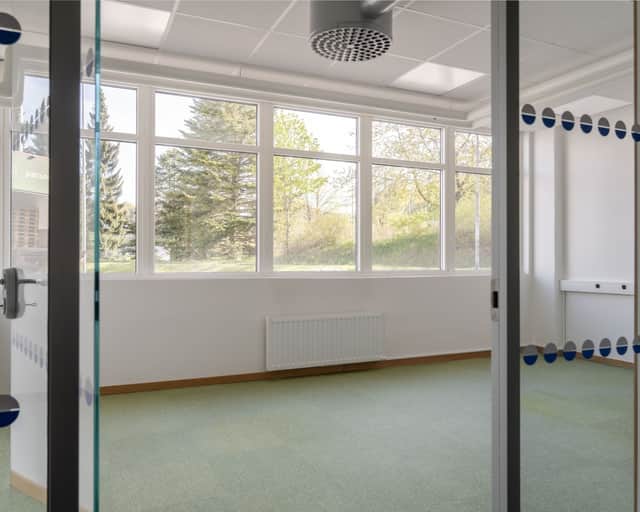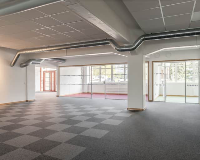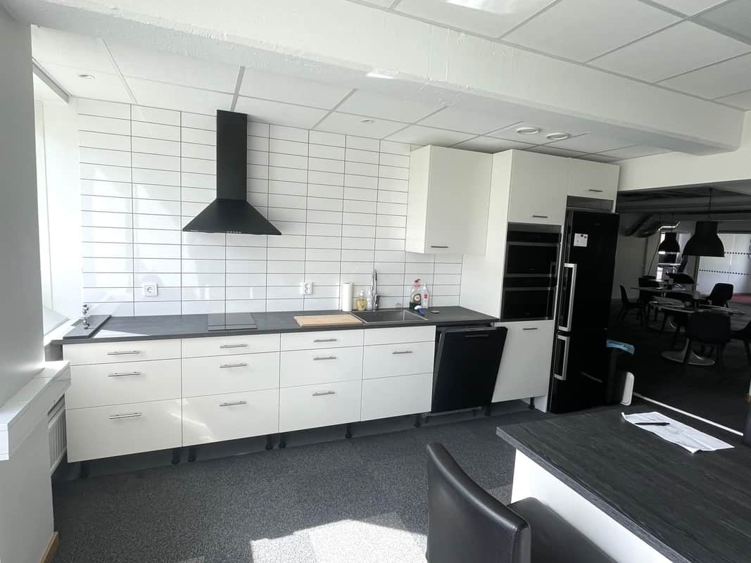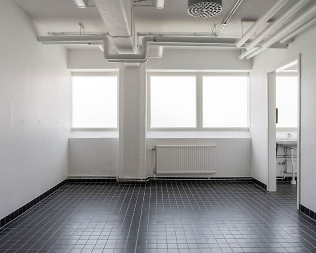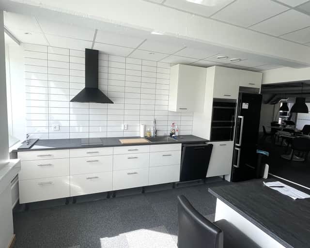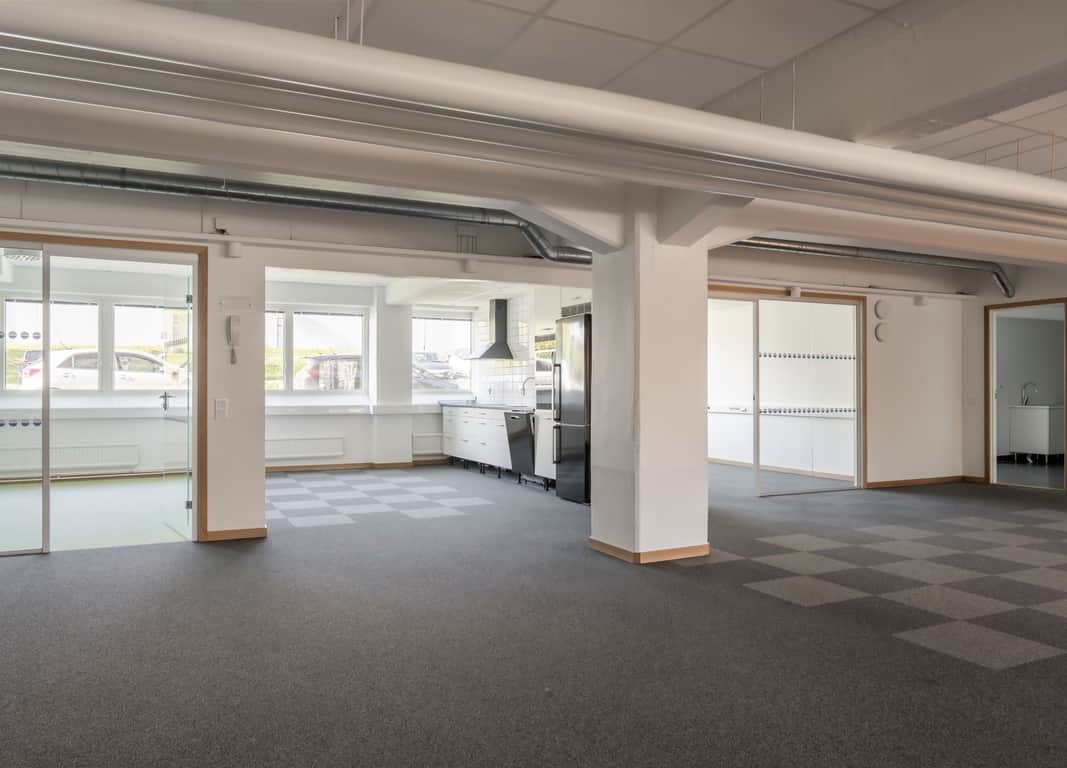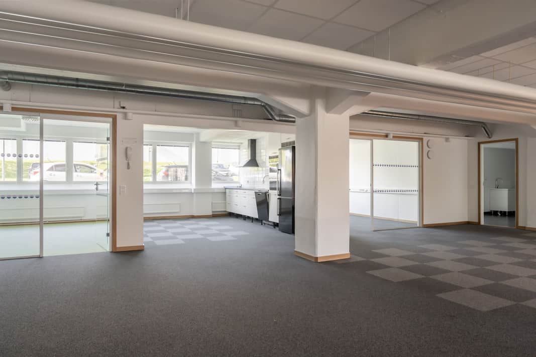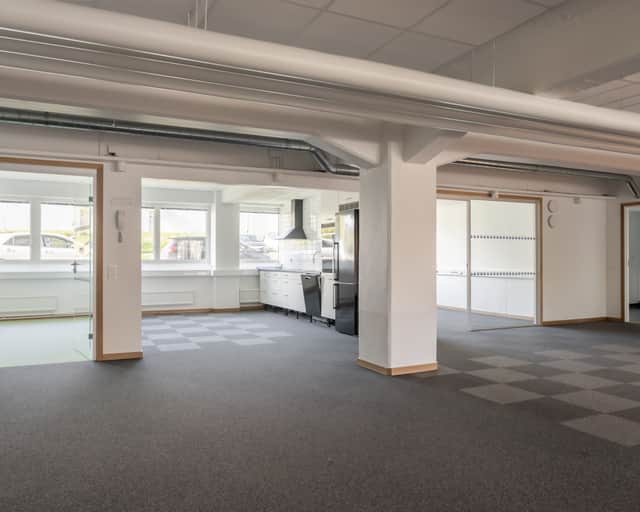 Öppna ytor samt enskilda kontorsrum, omklädningsrum med duschar.