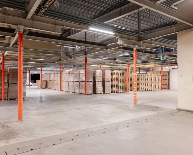 Lagerdelen har en stor öppen planlösning som ger utrymme för flexibla lösningar i markplan i kombination med kontor om ca 250 kvm och möjlighet till omklädning och dusch.