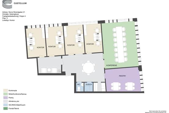 Lokalen har en öppen och flexibel planlösning med stora arbetsytor och flera kontors- och mötesrum. Här finns pentry, pausytor och förvaringsmöjligheter, och planlösningen kan enkelt anpassas efter verksamhetens behov. De stora fönstren ger rikligt med dagsljus och en luftig känsla genom hela kontoret.