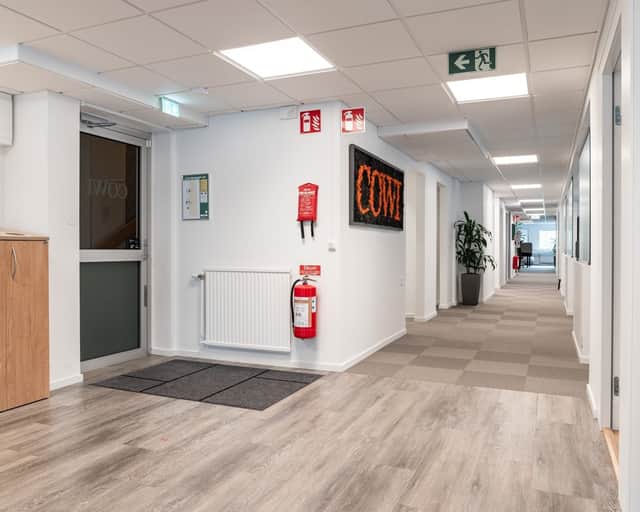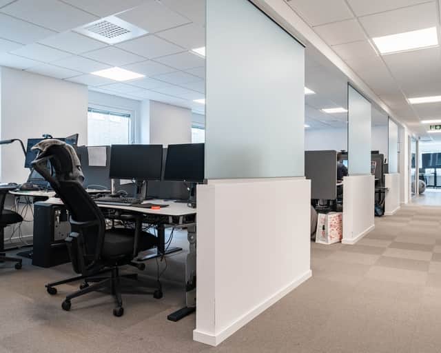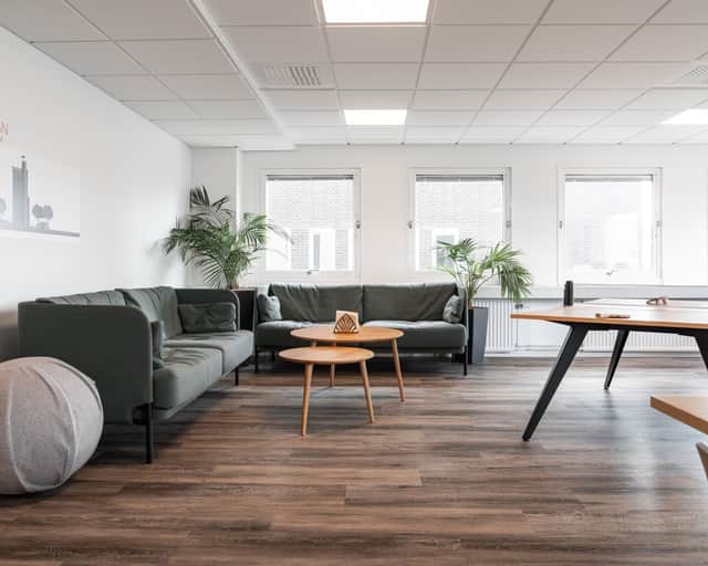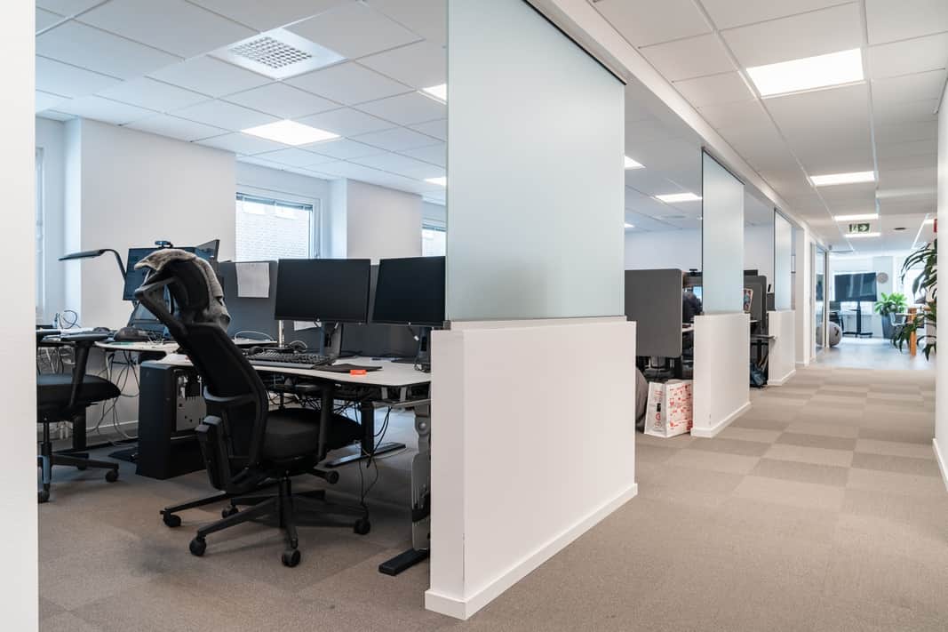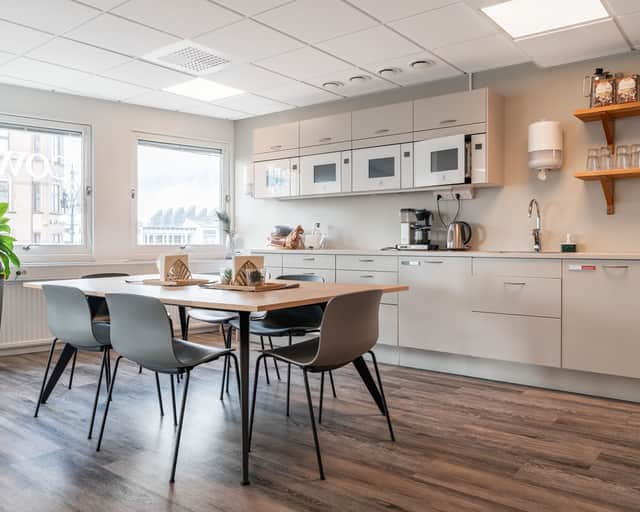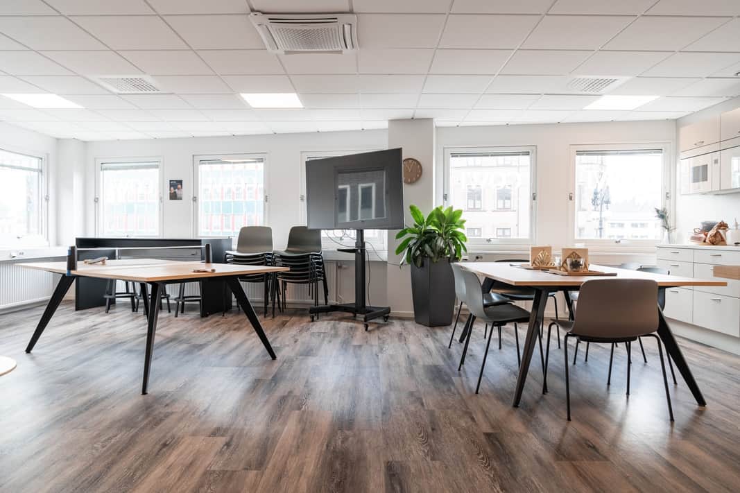 Lokalen har en öppen och flexibel planlösning med stora arbetsytor och flera kontors- och mötesrum. Här finns pentry, pausytor och förvaringsmöjligheter, och planlösningen kan enkelt anpassas efter verksamhetens behov. De stora fönstren ger rikligt med dagsljus och en luftig känsla genom hela kontoret.