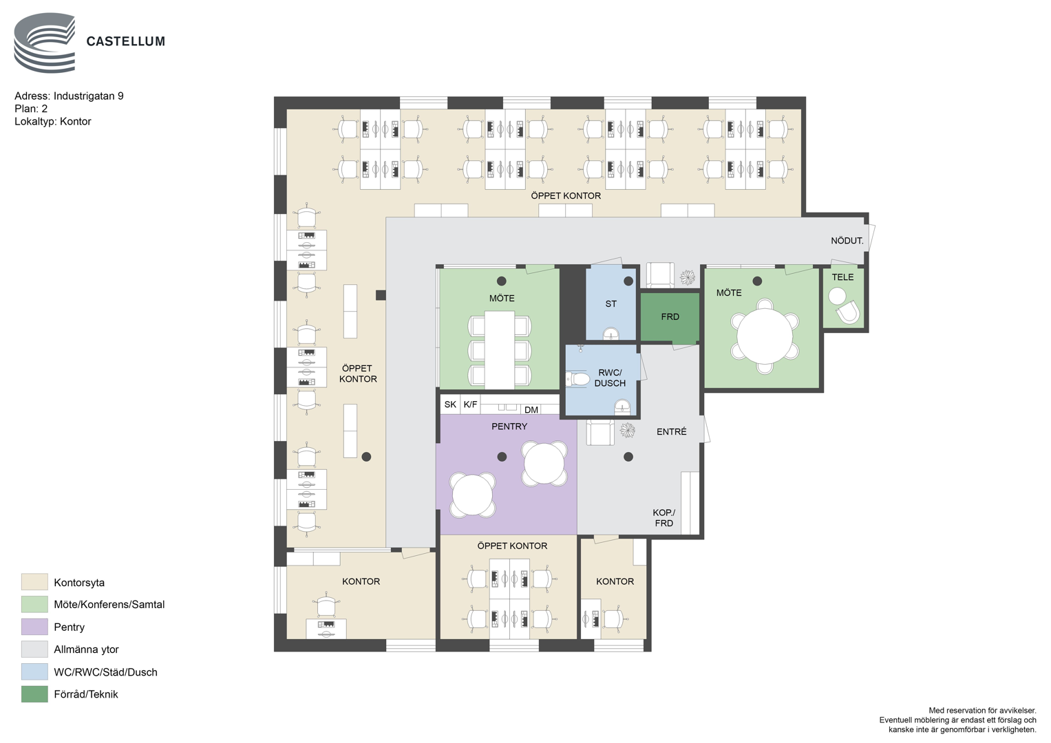Öppna arbetsplatser, kontor/mötesrum i varierande storlekar, välkomnade pentry med ansultande pausyta samt rwc med dusch.