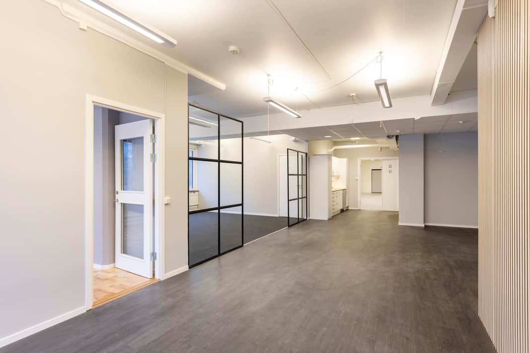 Planlösningen i kontorsdelen består av en öppen yta, ett konferensrum och pentry. Lokalen har fina, ljusa ytskikt och många fönster som ger ett härligt ljusinsläpp.