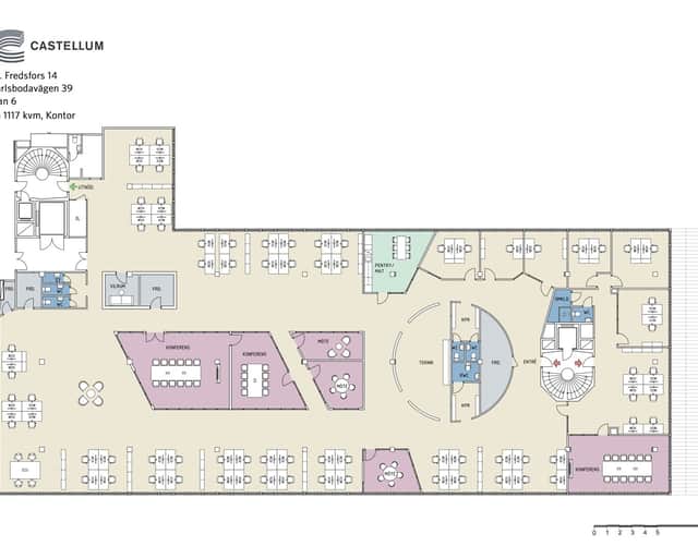 Planlösningen består av en öppen yta, konferensrummen är strategiskt bra placerade i mittkärnan av lokalen. Lokalen kan delas upp i två delar.