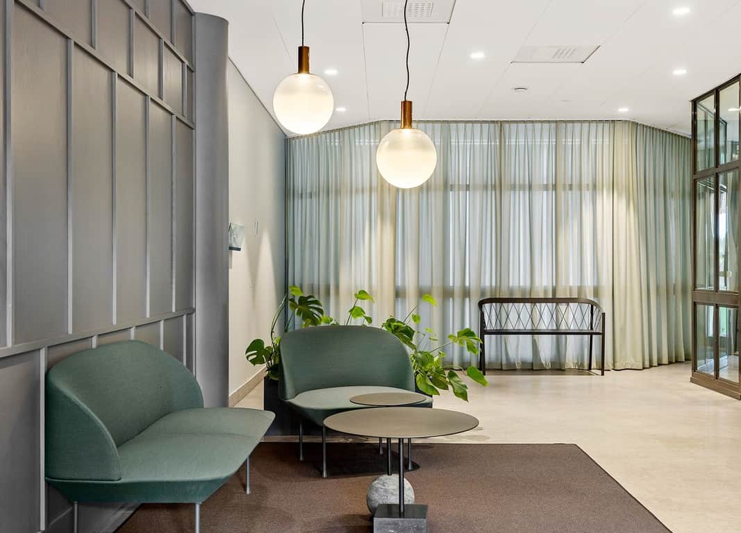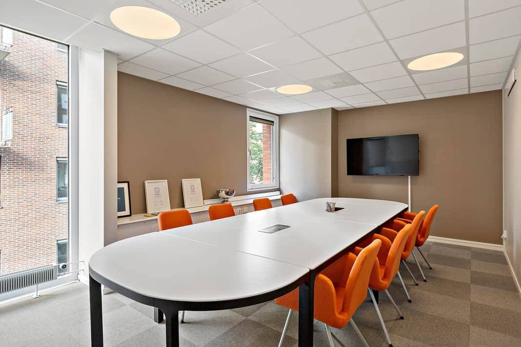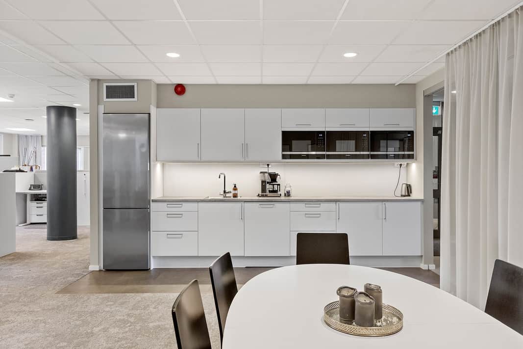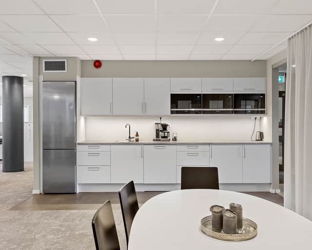 Interiören präglas av moderna materialval och en varm färgsättning som bidrar till en behaglig atmosfär för både medarbetare och besökare. Det är en lokal som kombinerar funktionalitet med stilren design, redo att anpassas efter ert företags behov.