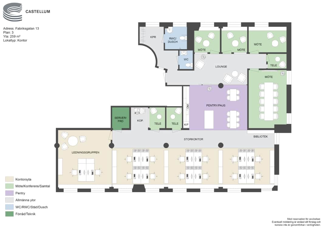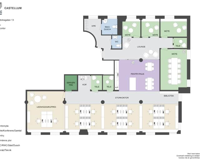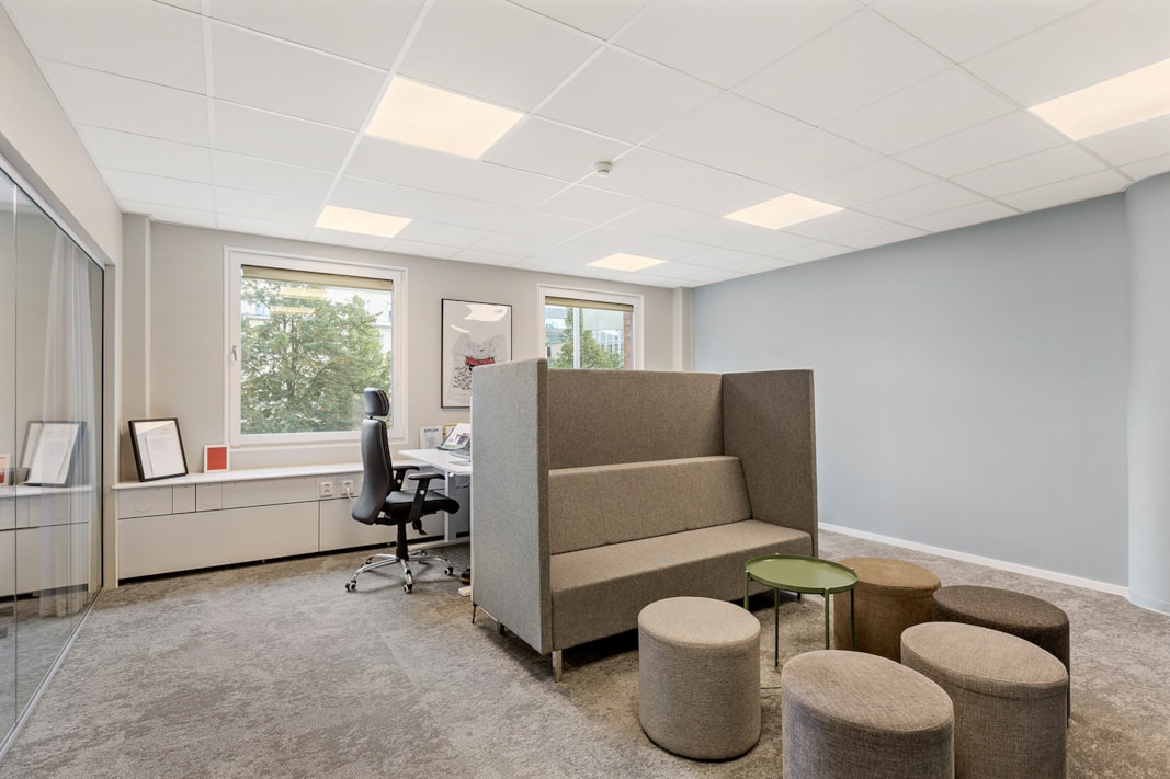 Lokalen har en blandad planlösning med öppna landskap, öppen pausyta, mötesrum, kontorsrum och tystarum i olika storlekar.