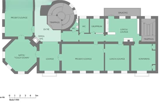Kontoret har en effektiv och modern planlösning med öppen yta som kompletteras av två stora konferensrum och två mindre mötesrum. Därtill finns tre WC, dusch, pentry samt trevliga gemensamhetsytor som skapar goda förutsättningar för både fokuserat arbete och samarbete.