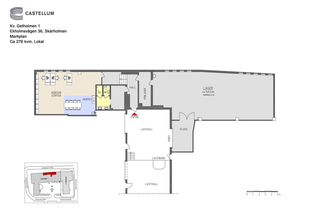 Till lokalen hör även en kontorsdel om cirka 69 kvm med plats för arbetsplatser och mötesrum – en praktisk lösning för verksamheter som vill samla administration och lager under samma tak.